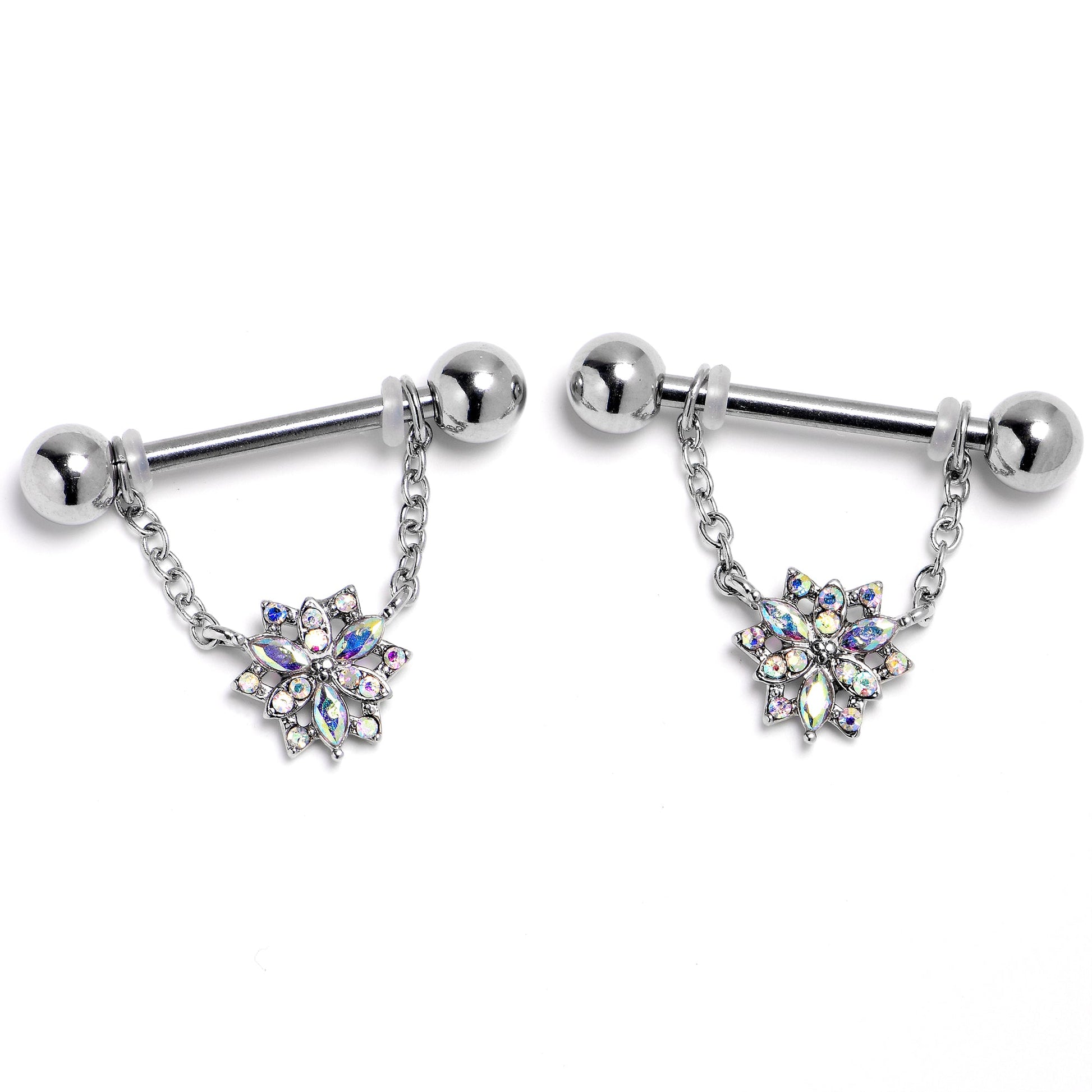 14G 9/16 Aurora Gem Snowflake Style Chain Dangle Nipple Ring Set