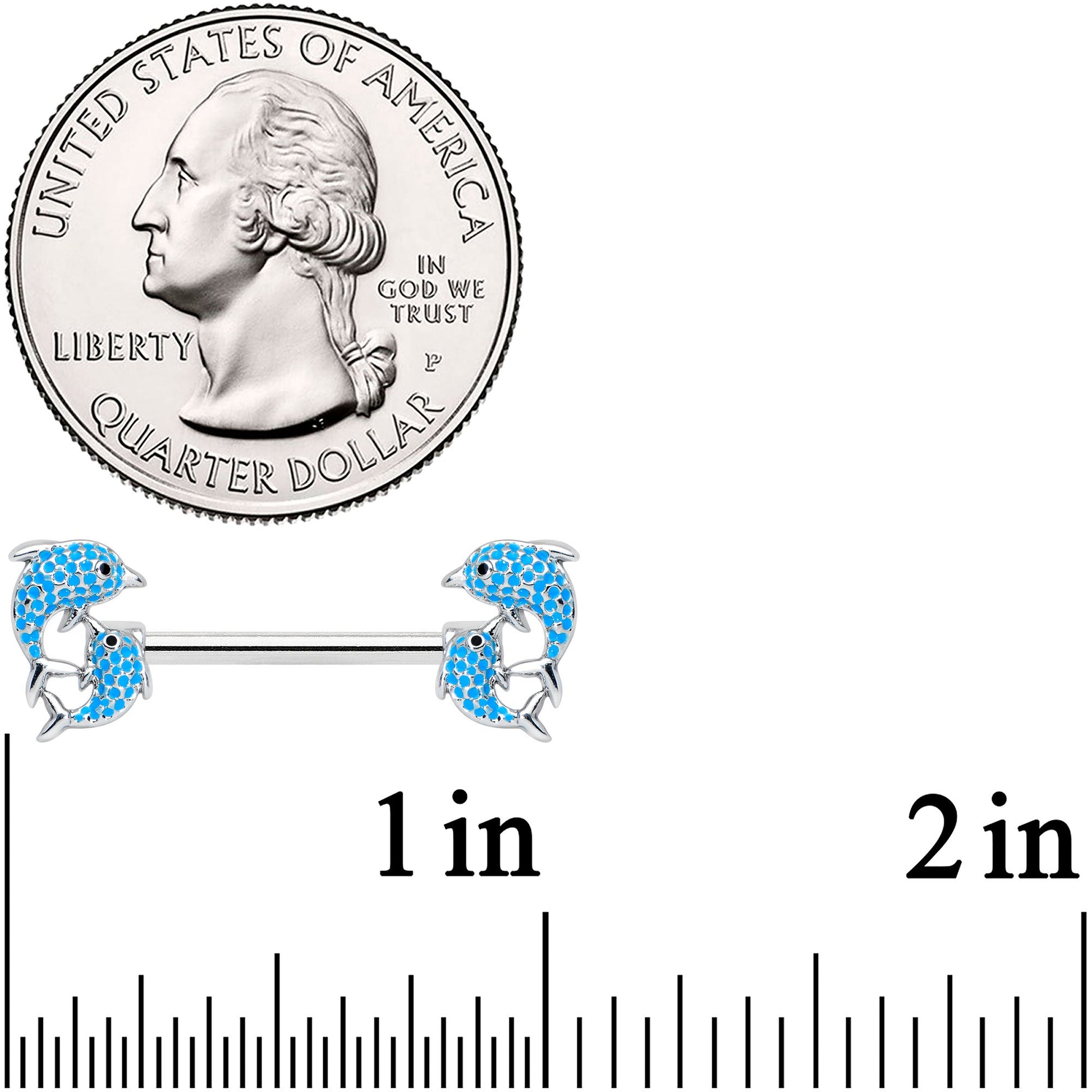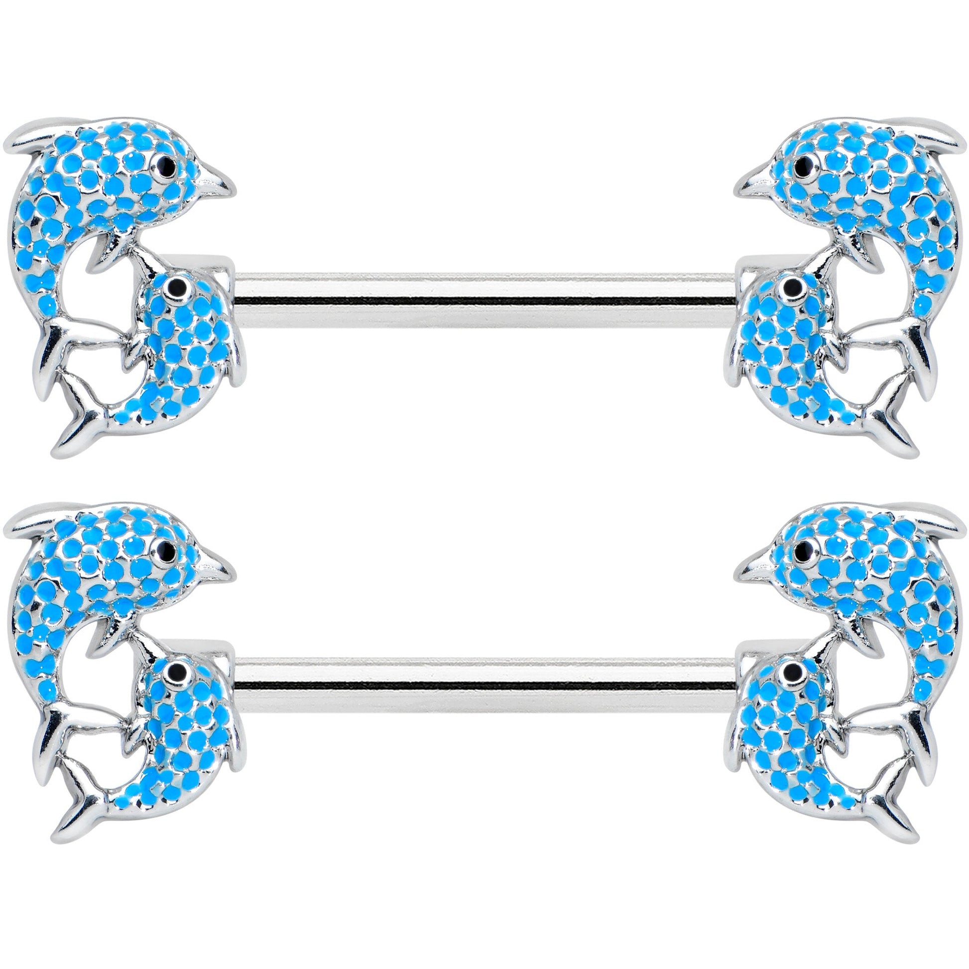 You'll be leaping for joy when you're rocking this 14 gauge nipple jewelry! It's made with 14mm durable 316L surgical grade stainless steel straight barbells. Each of the ends features a pair of leaping dolphins, set with blue gems for realistic color and featuring a tiny black gem eye. Whether you're daffy for dolphins or mad for marine mammals, these delightful dolphin nipple rings are sure to please! Sold as a set of two.Specifications