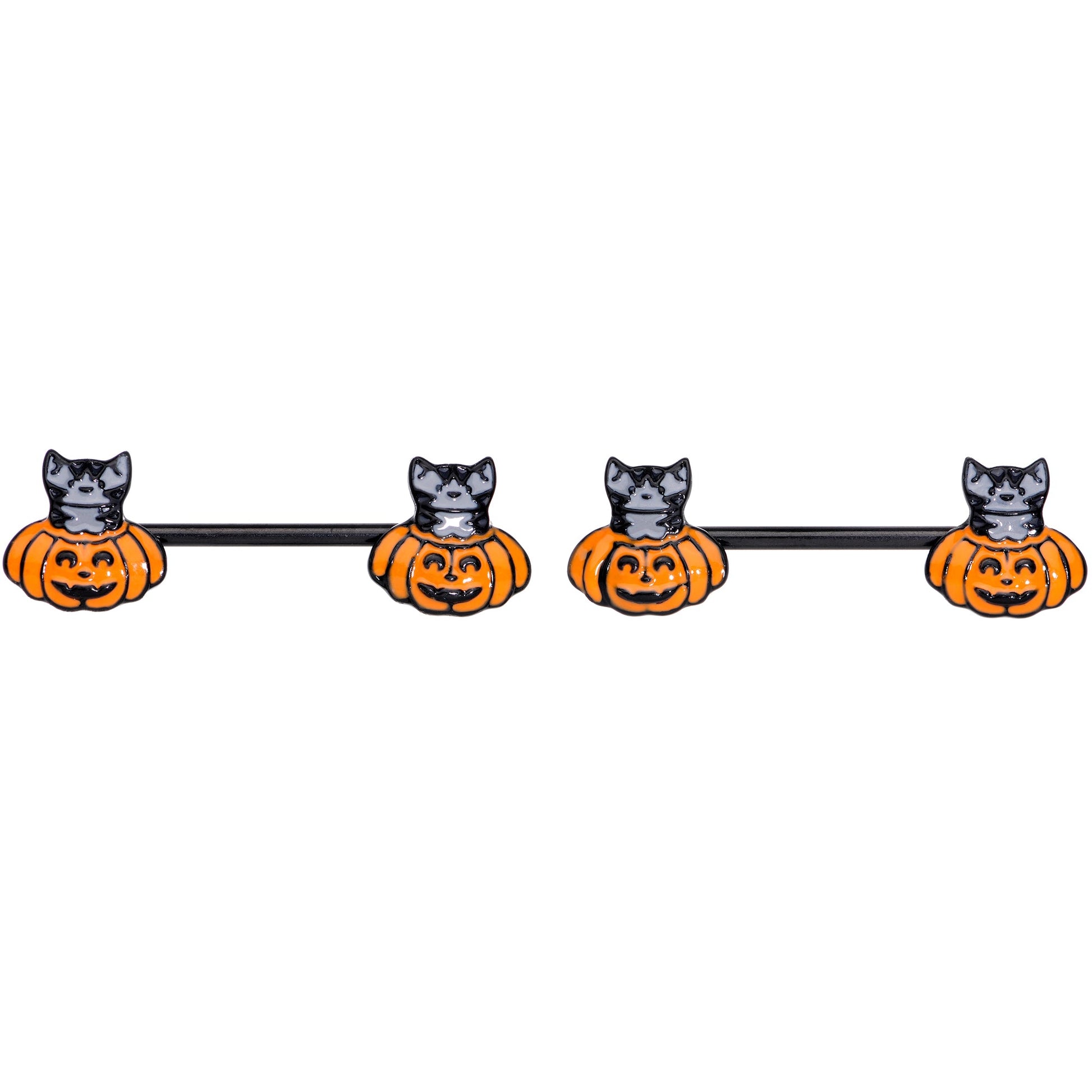 Don't worry about watching out for black cats this Halloween when you wear this 14 gauge nipple jewelry; you'll be wearing them all the time! Made with 14mm black PVD over 316L surgical grade stainless steel barbells, each of the ends features a charm of a black cat in a jack 'o lantern that will be a spooky surprise for anyone you meet! These Halloween kitties are ready to come out and play! Sold as a set of two.Specifications