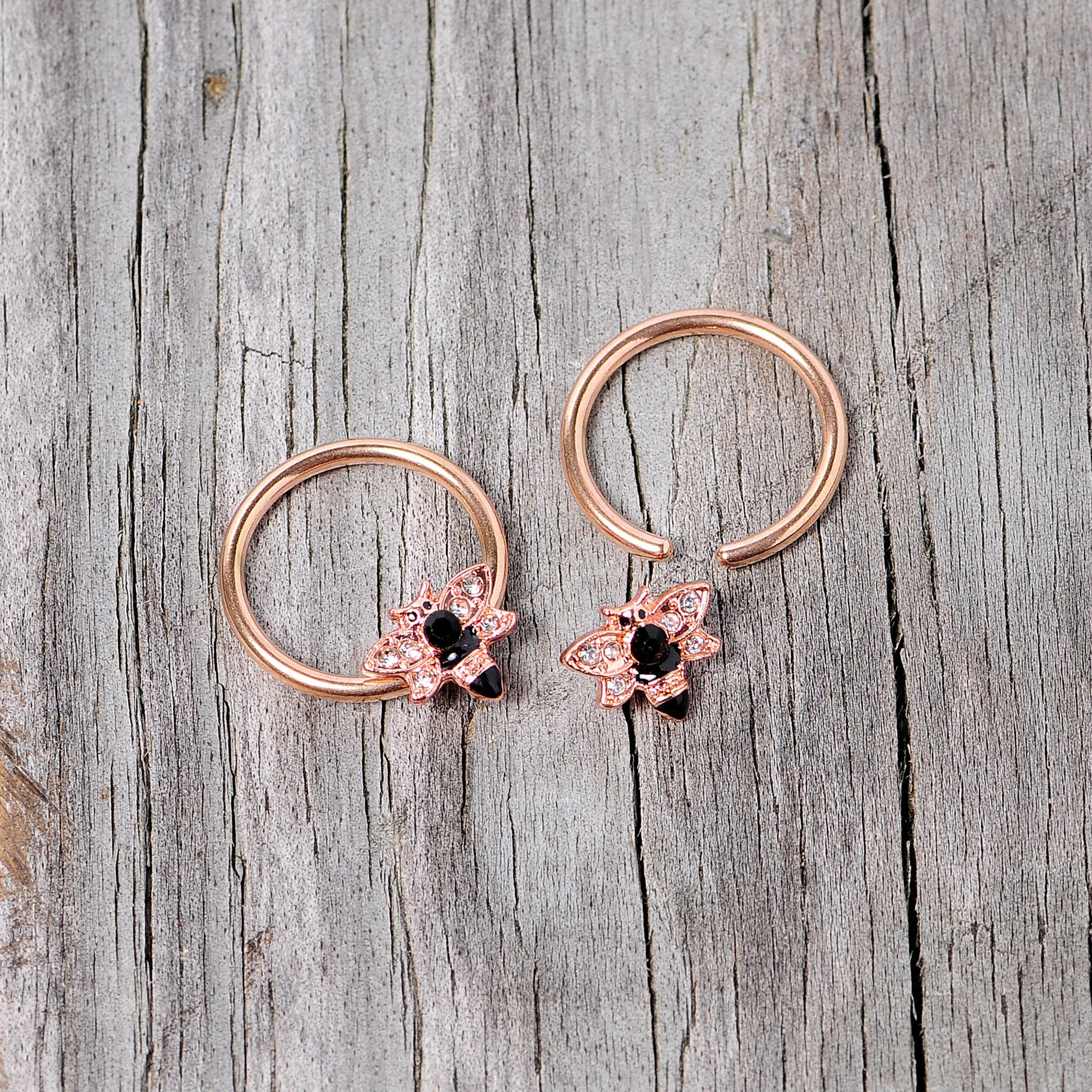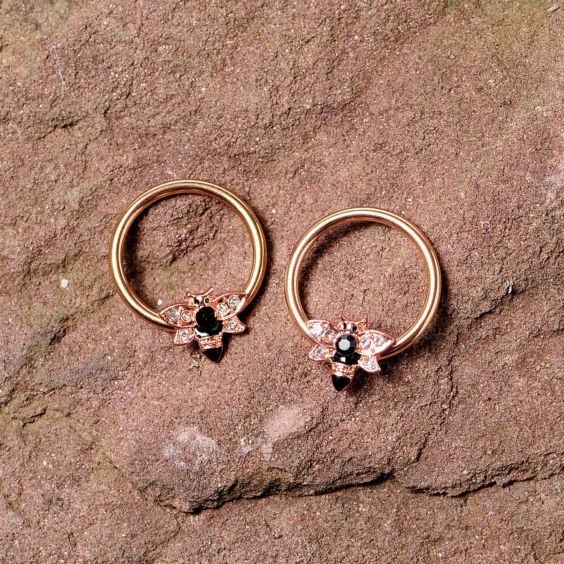 You'll be absolutely infatuated with the insects on these 14 gauge nipple rings! They're made with 14mm rose gold PVD over 316L surgical grade stainless steel circular ringsthat feature captive bee charms with black gems. The bees have clear gems set into their wings too! With these in your nipple piercings, you're sure to be all the buzz! Sold as a set of two.Specifications