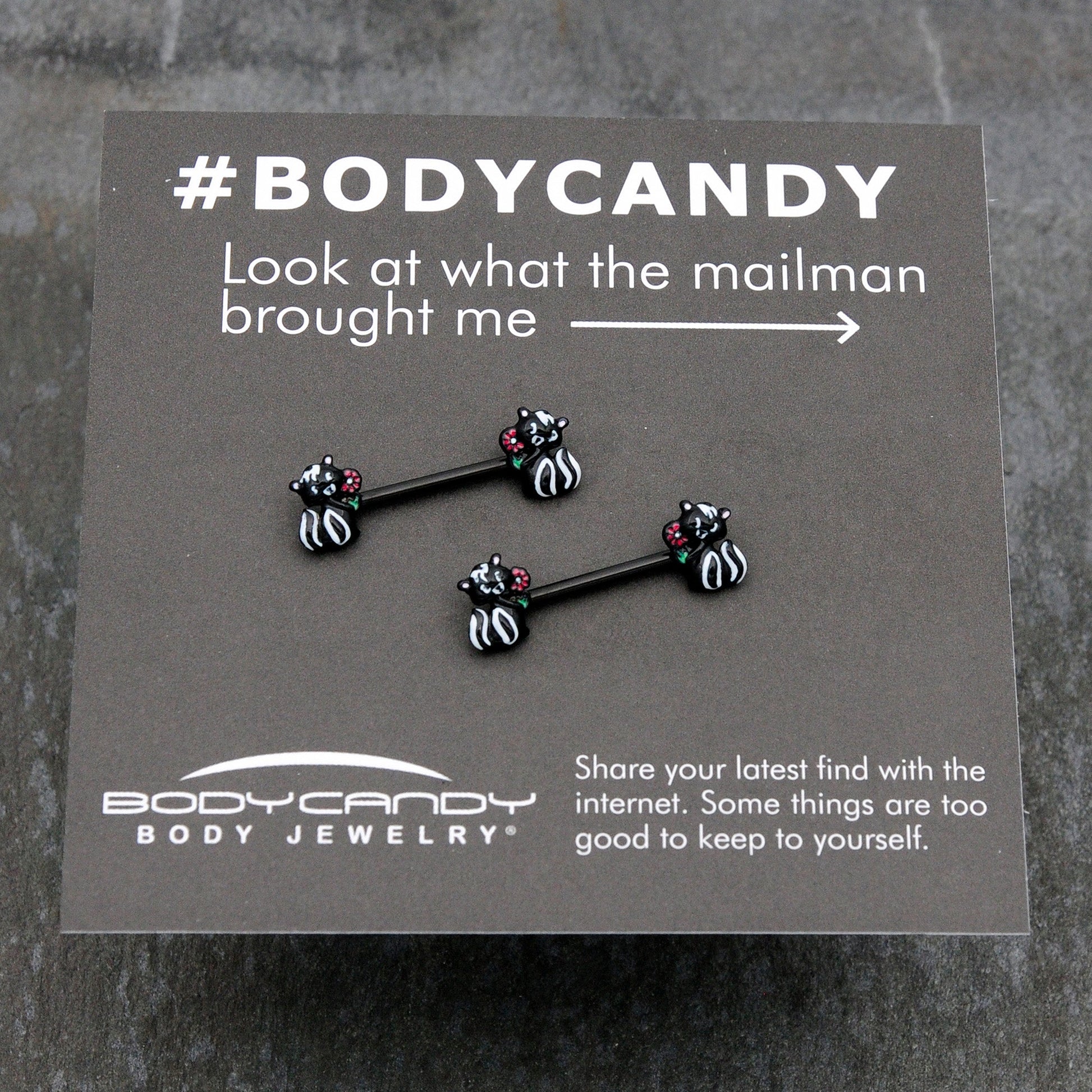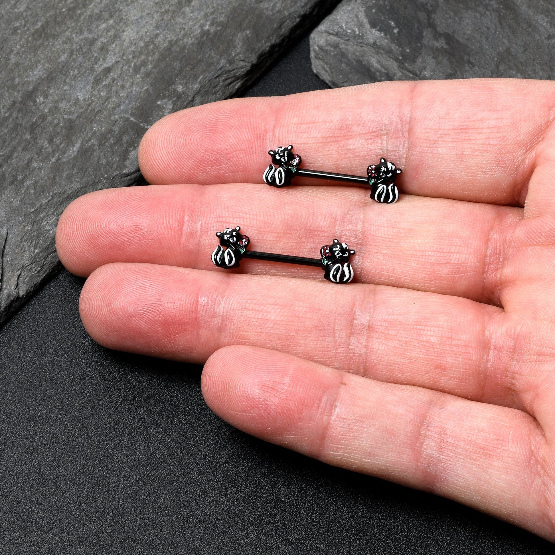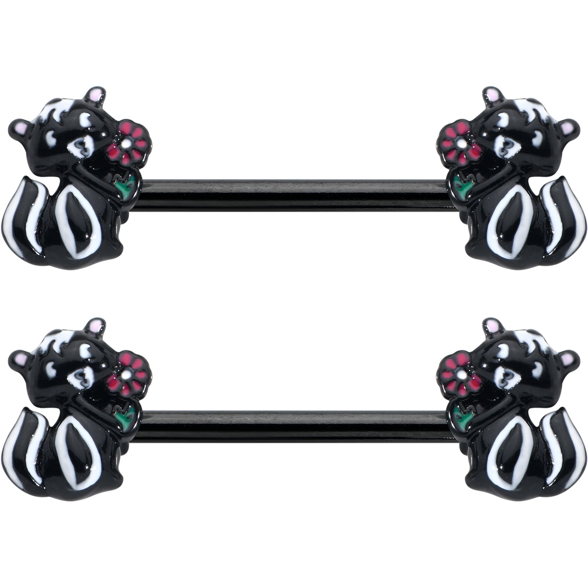 Get funky with the skunkies on this 14 gauge nipple jewelry. It is made with 14mm black PVD over 316L surgical grade stainless steel straight barbells. Each of the ends features an adorable skunk charm. The skunks feature black and white inlay and are each clutching a red inlaid flower for an extra sweet appearance. You will fall in love with these little stinkers on these sweetheart skunk nipple piercing rings. Sold as a set of two.Specifications