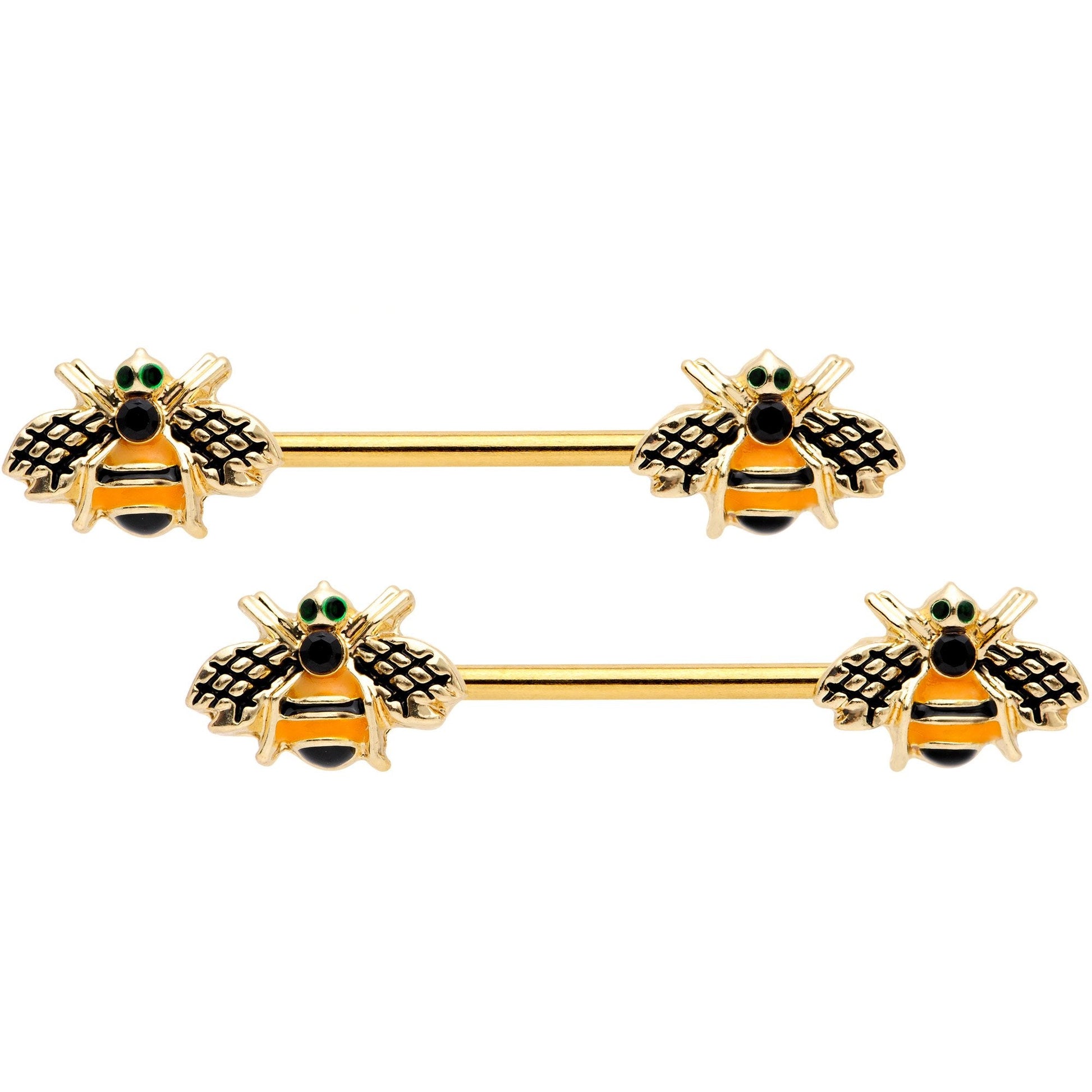 Let your piercings "bee" beautiful with these 14 gauge nipple piercings! They're made with 9/16" gold tone PVD over 316L surgical grade stainless steel straight barbells. The ends feature bumblebees, wings spread wide, with their iconic yellow and black stripes inlaid in color. Each one has a black gem set in their thorax and two more tiny black gems for eyes. Their wings are engraved with textured detailing which has been burnished to truly make it stand out. Even their legs have been thoughtfully added for an even further look of realism. Pop them in your piercings - they'll look absolutely bee-witching! Sold as a set of two.Specifications