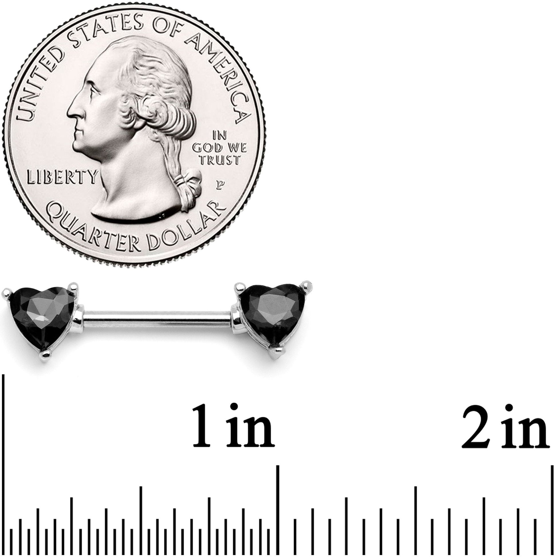 Some people are afraid of the dark....and some people love it. If you fall into the latter category, these 14 gauge nipple piercings are meant for you. They're 14mm long for comfort and feature heart shaped black gems at the ends. And they're made of durable 316L surgical grade stainless steel straight barbells so you know they're meant to last. The darkness always passes but these beauties will be around for a long time! Sold as a pair.Specifications