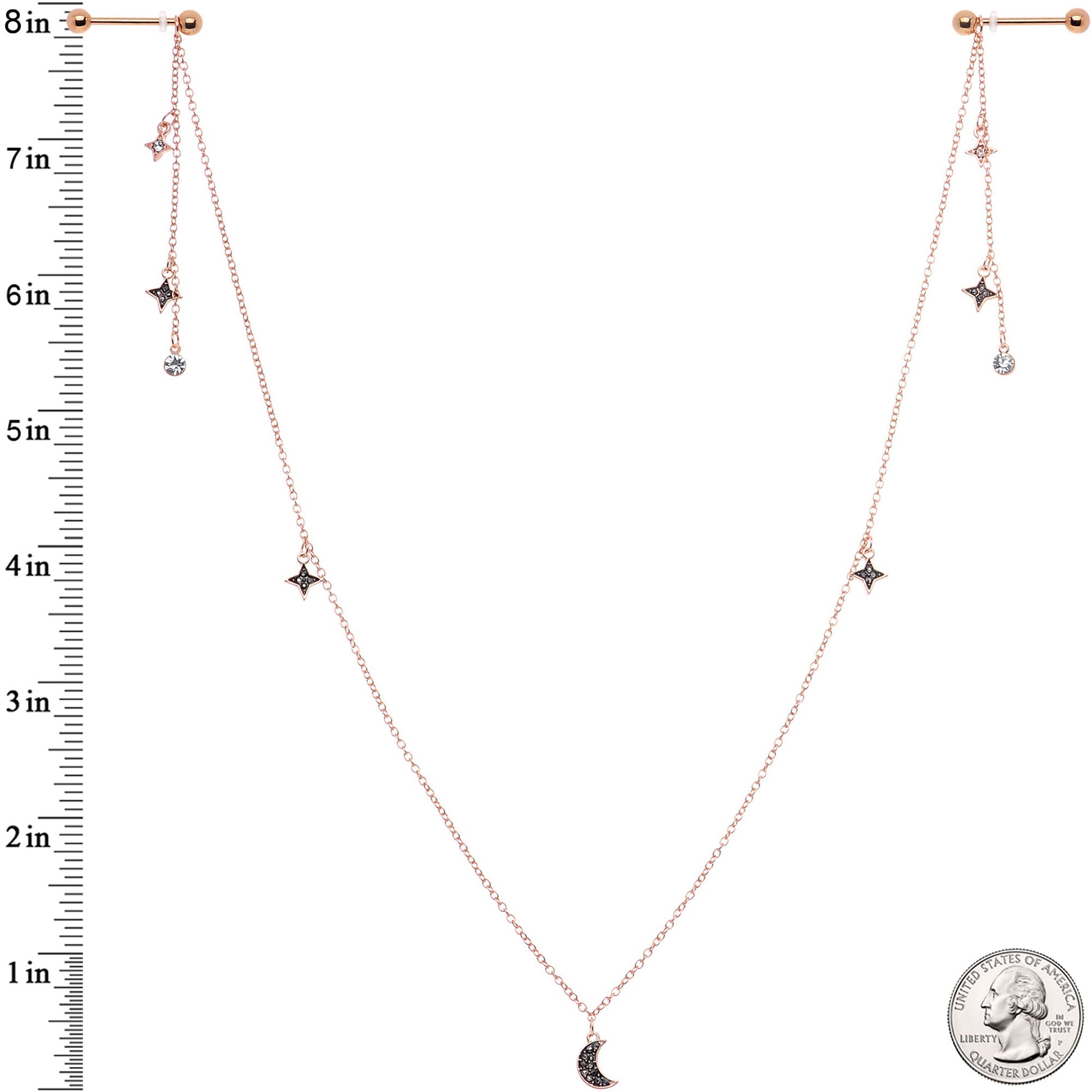 Whether you're starstruck or a little spaced out, this 14 gauge nipple jewelry is perfect for you! It's made with 14mm rose gold tone PVD over 316L surgical grade stainless steel straight barbells with 5mm ball ends. Dangling between the barbells are 15" lengths of matching rose gold tone chain, with another 2" dangling from the ends of the barbells. Dangling from the chains are several black gem star charms with a matching black gem crescent moon charm in the center. The ends of the chain are tipped with small round clear gems for a striking contrast. This nipple chain is downright heavenly!Specifications