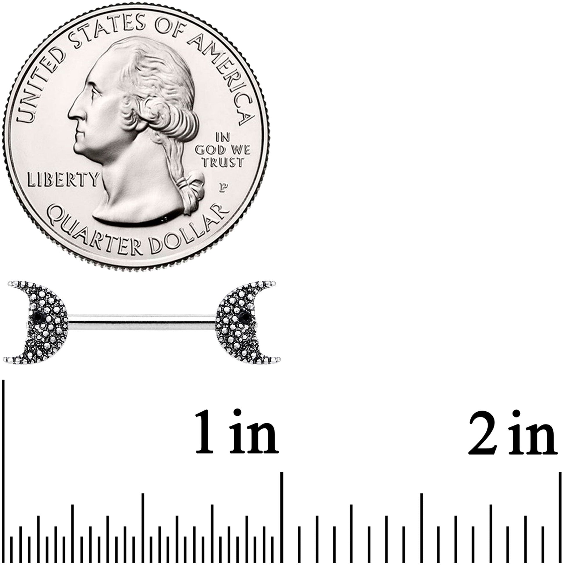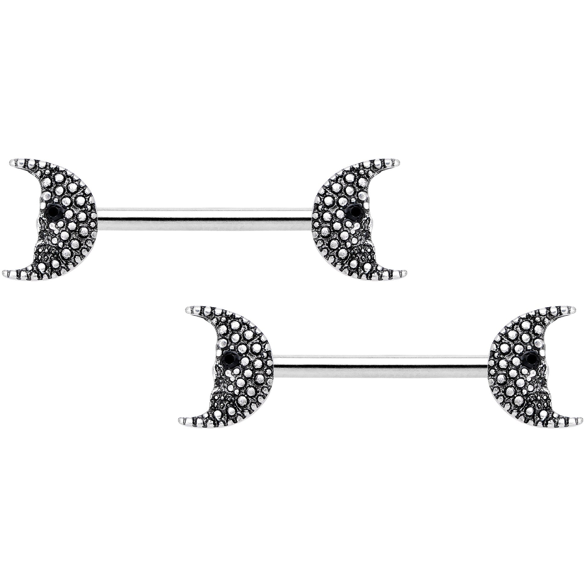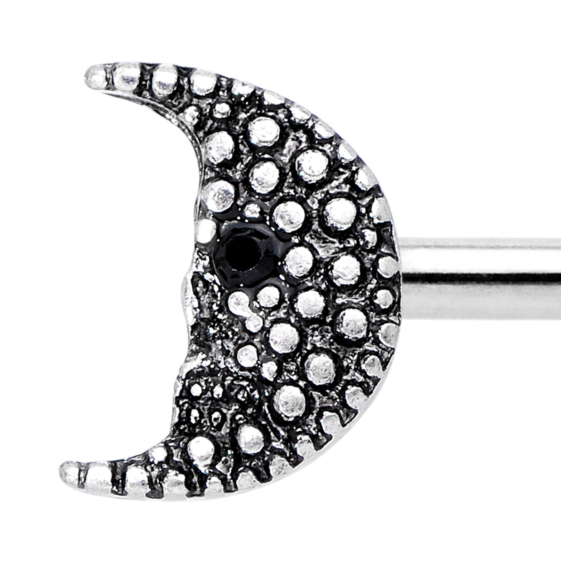 The man in the moon is looking a little grim these days, going from a giant rock to a rock and roll giant! This 14 gauge nipple jewelry is made with 14mm durable 316L surgical grade stainless steel straight barbells. Each end features a crescent moon with a pebbly texture, toothy grimace, and small black gems for eyes. Now you can hang out with the biggest "rock star" in all the night sky! Sold as a set of two.Specifications