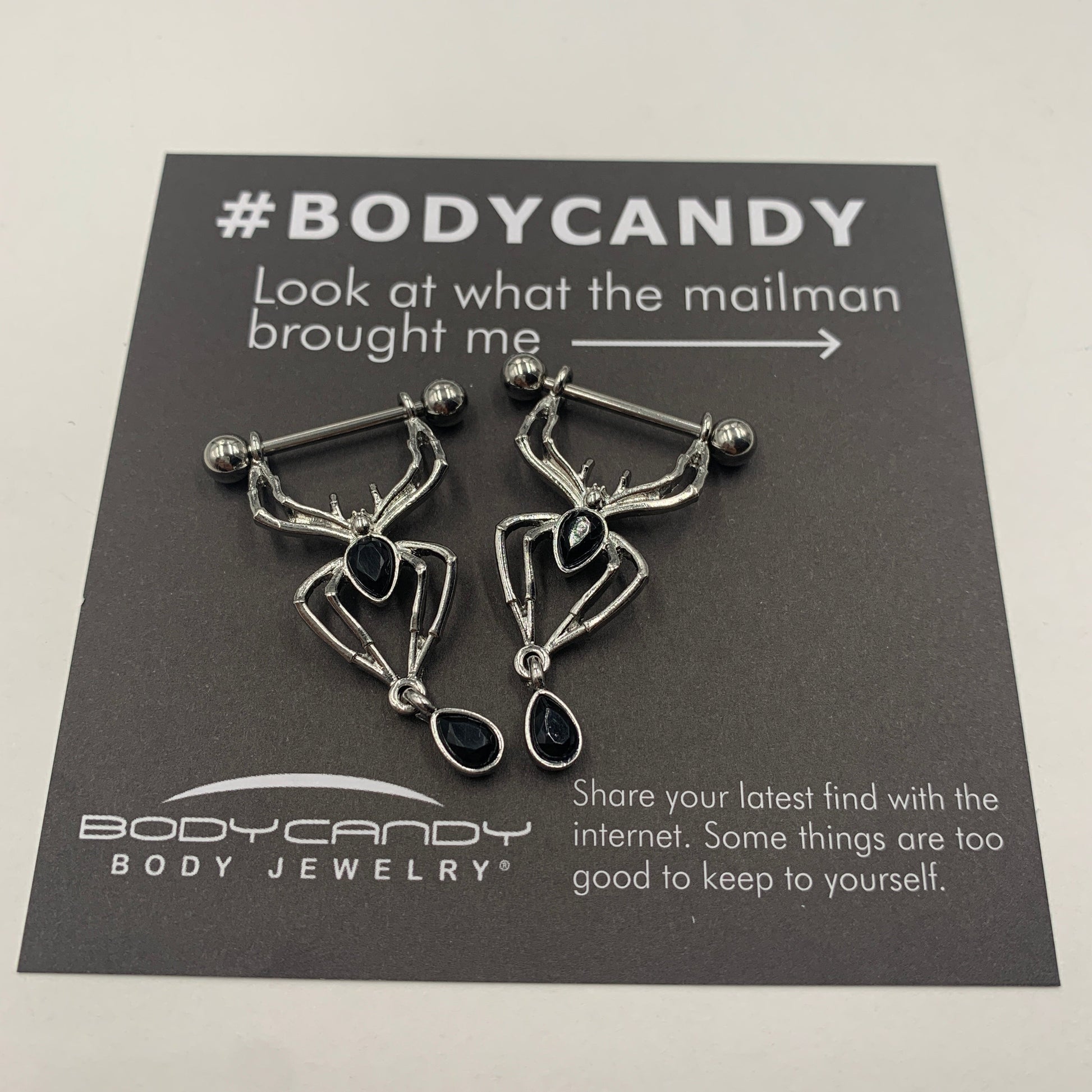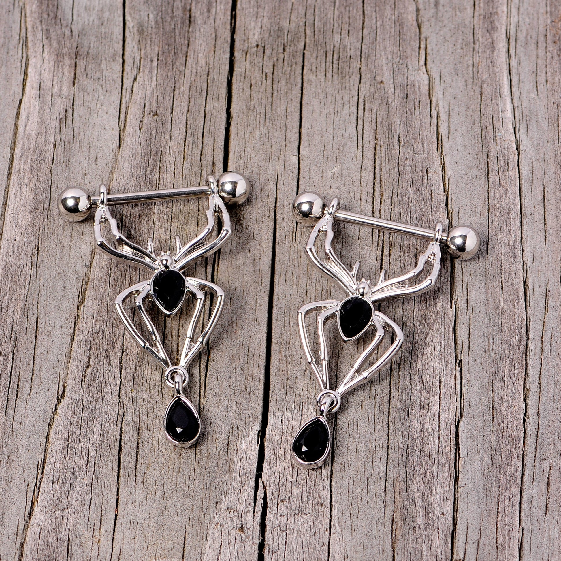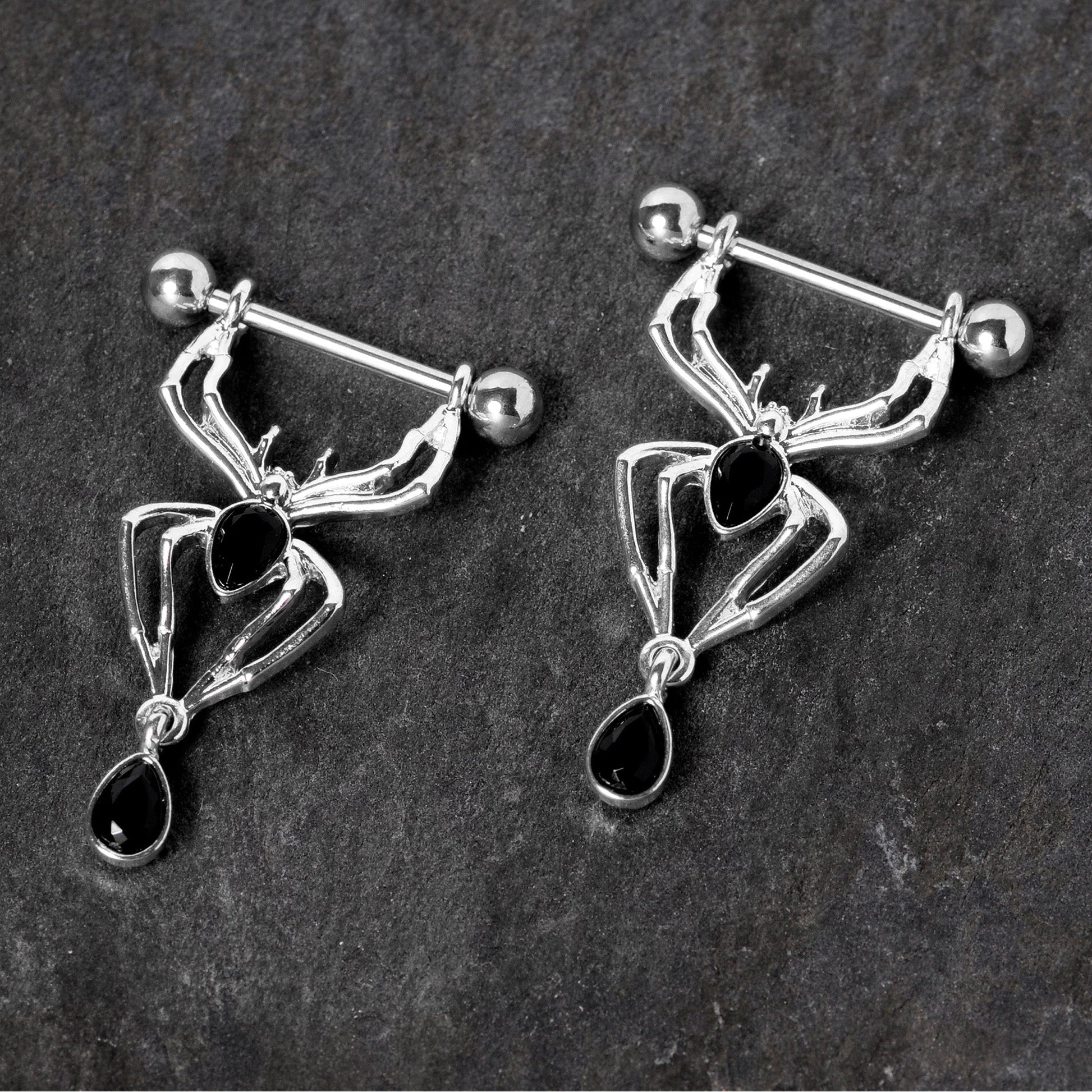 14G 9/16 Black Gem Spider Halloween Dangle Nipple Ring Set