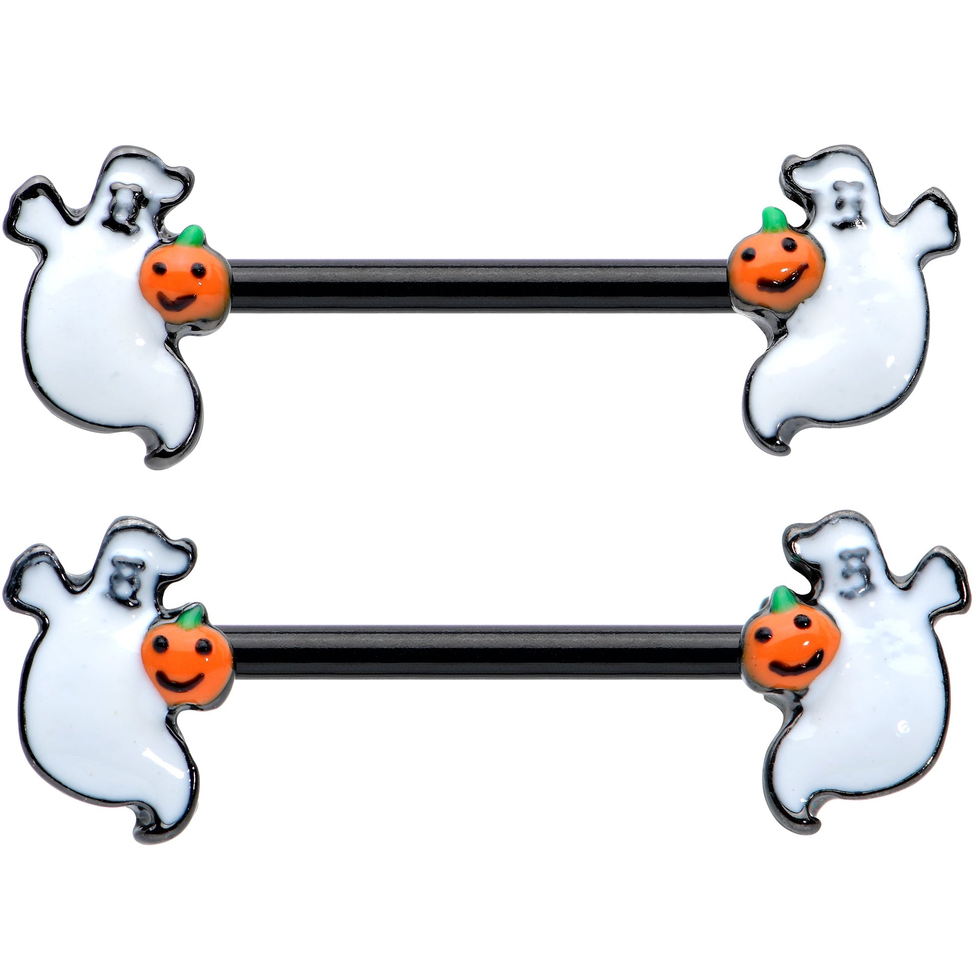 The ghosts on this 14 gauge Halloween nipple jewelry brought some friends along to party! It's made with 14mm black PVD over 316L surgical grade stainless steel straight barbells. Each of the ends features a spooky ghost charm, with white inlay. The ghosts are carrying orange jack o'lanterns for added color and creepy style. You'll be absolutely haunting this Halloween when you're rocking these ghoulish ghost nipple piercing rings! Sold as a set of two.Specifications