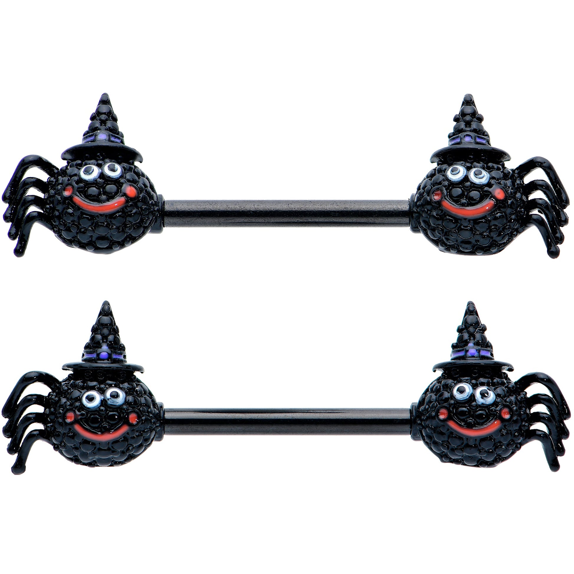 The spiders on this 14 gauge nipple jewelry are sure to cast a spell on you! It's made with 14mm black PVD over 316L surgical grade stainless steel straight barbells. Each of the ends features a witchy spider charm, complete with purple embellished pointy hats, and sweet smiling expressions. Let these eight-legged Halloween honeys cast their spell on you with these endearingly whimsical nipple piercing rings! Sold as a set of two.Specifications