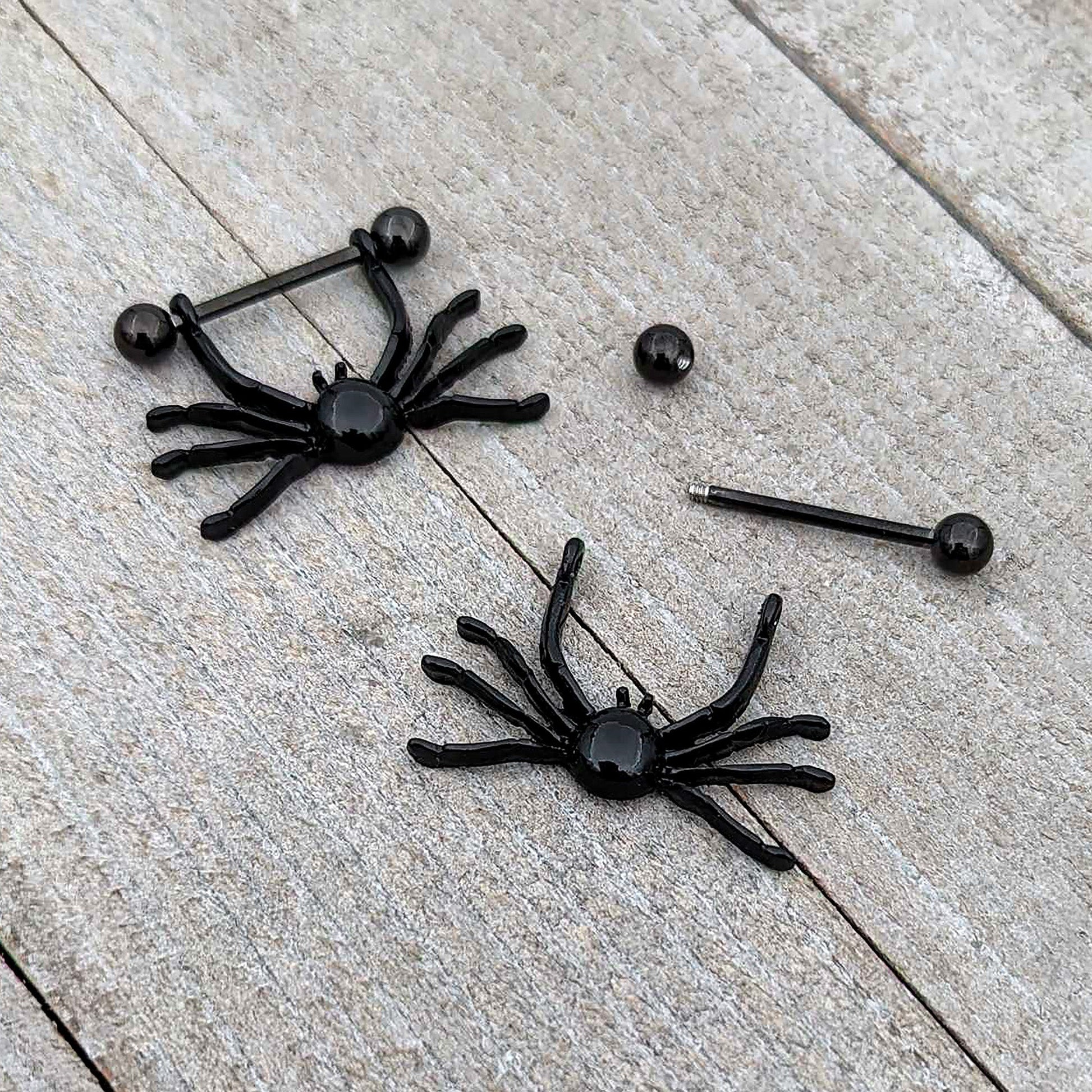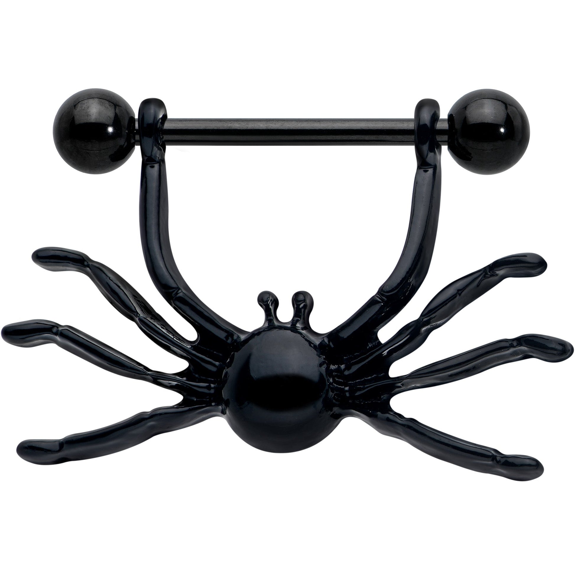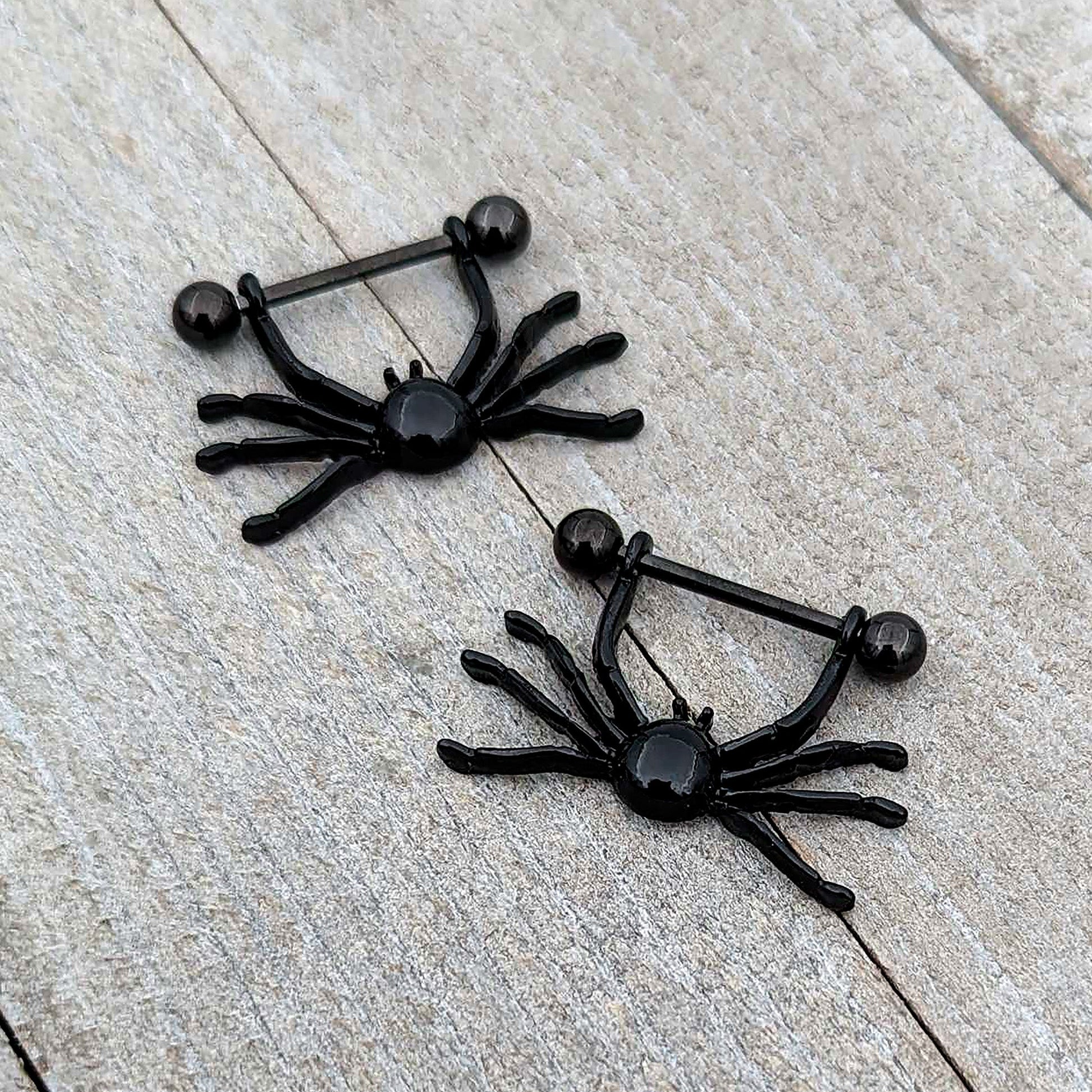 The spiders on this 14 gauge nipple jewelry are hardly eensy weensy. It is made with 14mm black PVD over 316L surgical grade stainless steel straight barbells with 5mm ball ends. The shield portions feature matching black spider charms, with individually defined legs and simple detailing. These amazing arachnids will help you spin a web of sexy style when you are rocking them in your nipple piercings. Sold as a set of two.Specifications