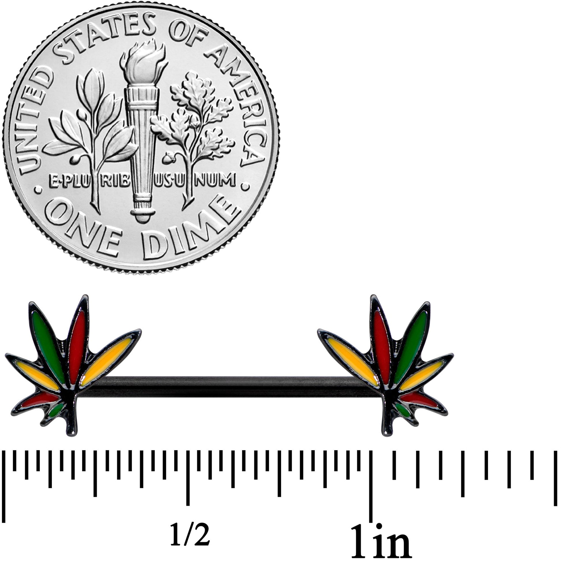Grab your bong - it's always 420 somewhere when you're rocking this 14 gauge nipple jewelry! It's made with 14mm black PVD over 316L surgical grade stainless steel straight barbells. Each of the ends features a pot leaf charm. The pot leaves are embellished with each segment set in a different color for a wild and stylish effect. Perfect for polished potheads and snazzy stoners, you'll love these nipple piercing rings so much you'll almost catch a buzz! Sold as a set of two.Specifications