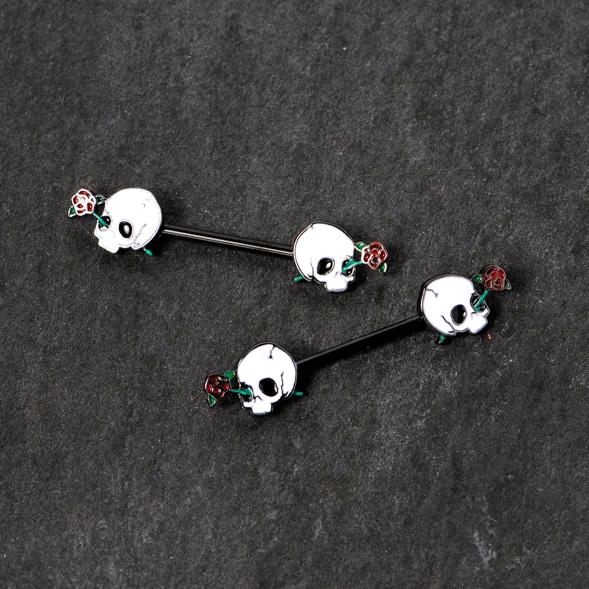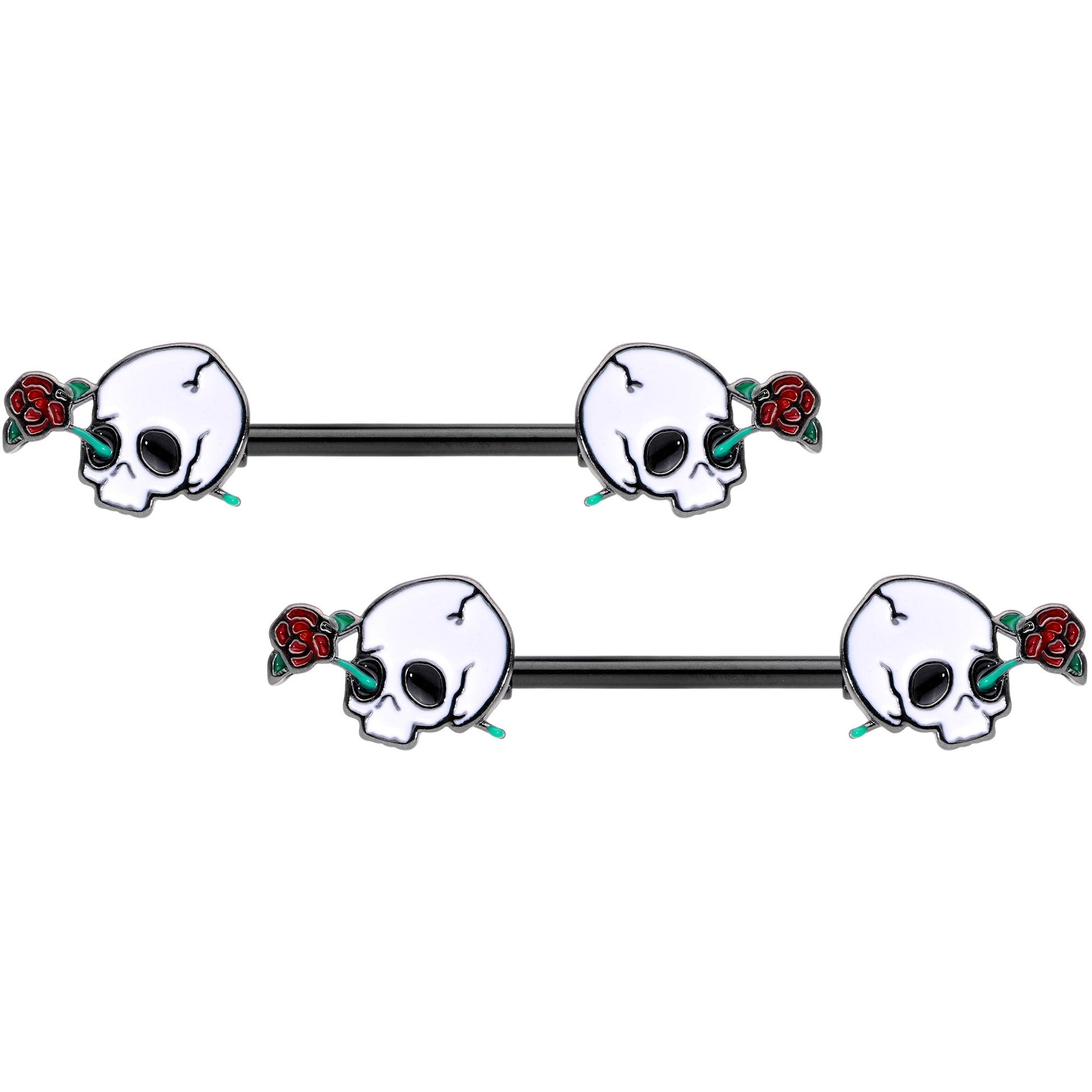 If you're ready to get into the spirit of Halloween then you will love these 14 gauge nipple piercings with a little spooky spirit! Made with 14mm black PVD over 316L surgical grade stainless steel straight barbells, this nipple jewelry features white skull charm ends with roses running through their eyes. Sold as a set of two.Specifications