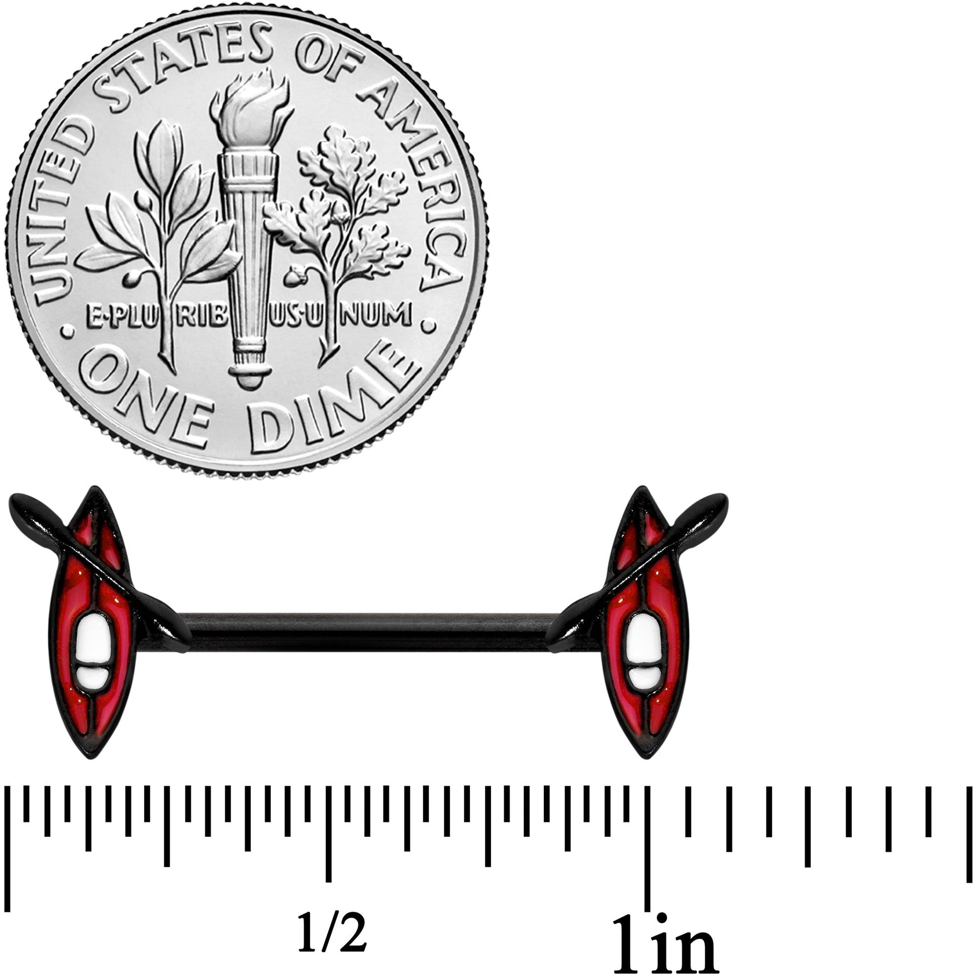 No matter how far you are from the water, you'll still be the first one on the boat with this 14 gauge nipple jewelry! It's made with 14mm black PVD over 316L surgical grade stainless steel straight barbells. Each of the ends features a red boat charm, cleverly detailed with a black paddle laid diagonally across it. Whether water sports thrill you or you're crazy for canoes and kayaks, these nautical-themed nipple piercing rings are sure to make waves! Sold as a set of two.Specifications
