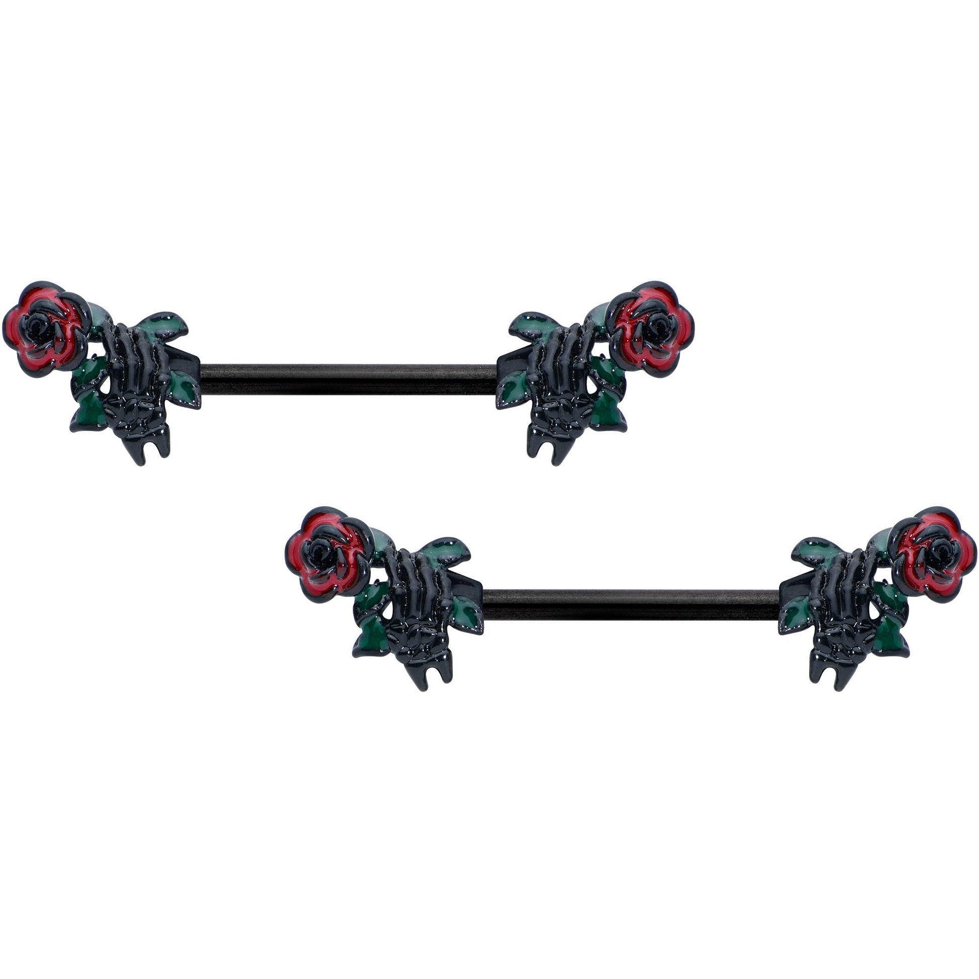Enjoy that scary, creepy feeling any time of year with this 14 gauge Halloween nipple jewelry! It's made with 14mm black PVD over 316L surgical grade stainless steel straight barbells. Each of the ends features skeleton hand charm ends holding roses. This set of nipple piercings will have you shouting, "Happy Halloween!" Sold as a set of two.Specifications