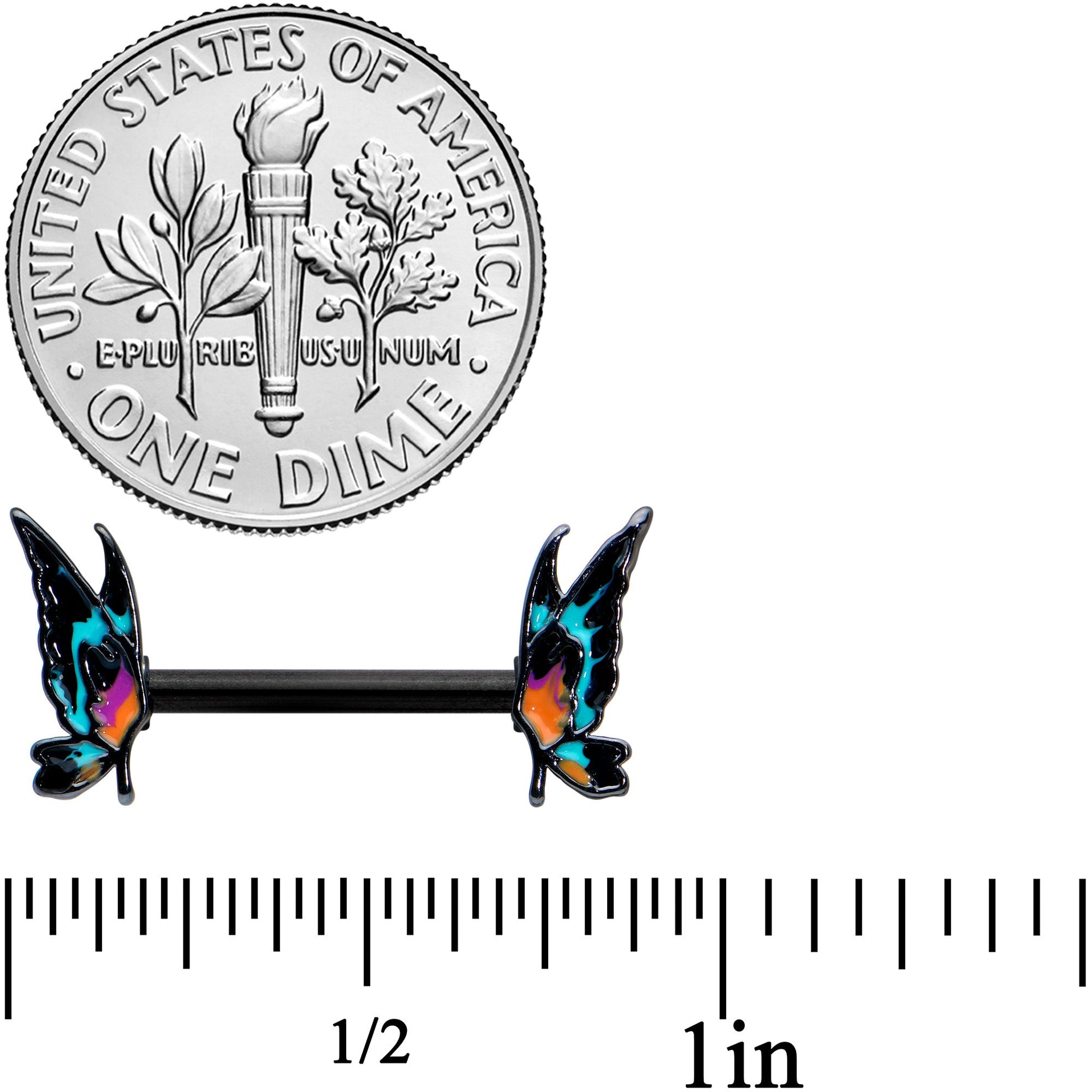 The butterflies on this 14 gauge nipple jewelry must have been kissed by the sunset to be so lovely! It's made with 14mm black plated over 316L surgical grade stainless steel straight barbells. Each of the ends features a butterfly charm, with their wings inlaid in shades of blue, orange, and purple. They're further embellished with black detailing. Sail happily into the sunset when you're rocking these beautiful butterfly nipple rings! Sold as a set of two.Specifications