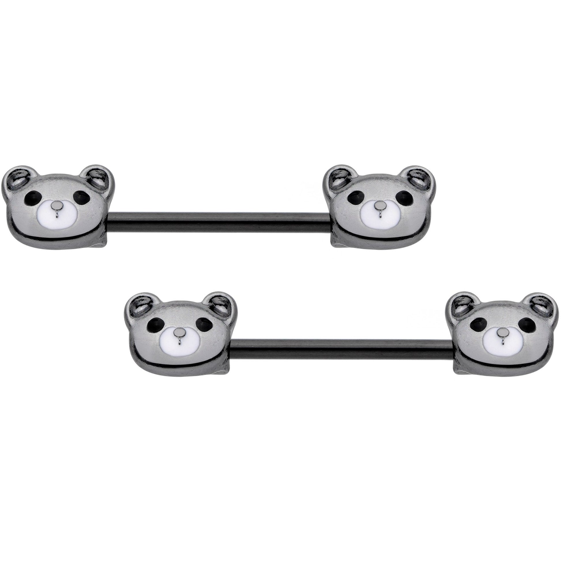 These little teddy bears have such sweet faces, how could you not want to make them your buddies? These 14 gauge nipple piercings are made with 14mm black anodized over 316L surgical grade stainless steel straight barbells. The ends feature our charming little bears with a sweetly wide-eyed expression like they're begging for your love. And you won't be able to help giving it to them with this charming barbell nipple jewelry! Sold as a set of two.Specifications