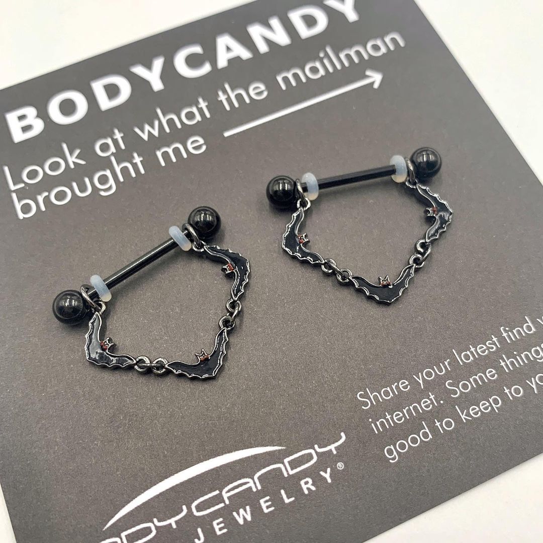 If you're ready to get into the spirit of Halloween then you will love these 14 gauge nipple piercings with a little spooky spirit! Made with 14mm black PVD over 316L surgical grade stainless steel straight barbells, this nipple jewelry features black bat dangle charms with three bats each strung together on each nipple barbell for scary fun! Sold as a set of two.Specifications