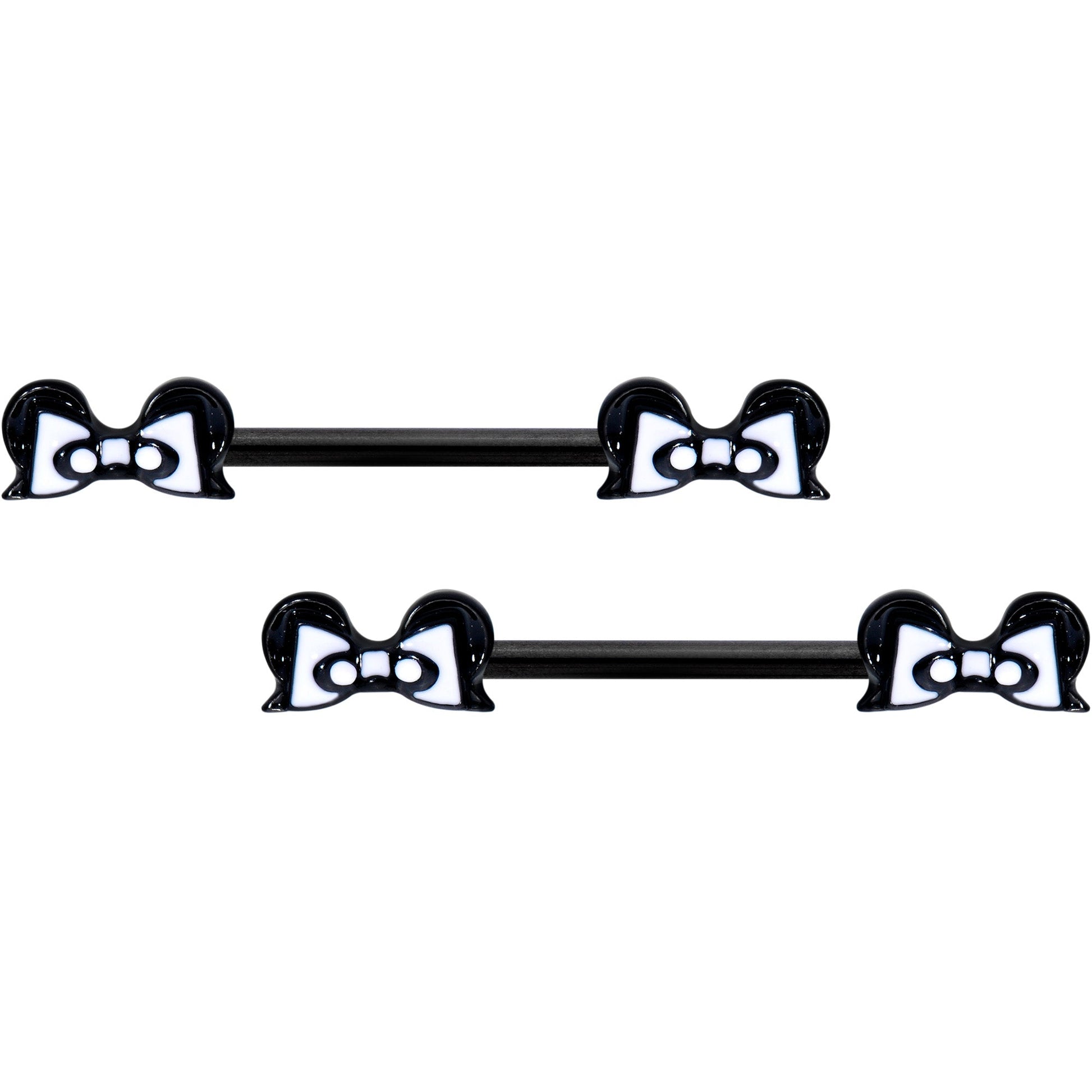 Give your nipple piercings a present with these 14 gauge nipple rings! They're made with 14mm black plated over 316L surgical grade stainless steel straight barbells. The ends feature charms of black and white bows with a stylized shape. The bows are embellished at the center with a trio of white dots for added texture and visual impact. Wrap your nipple piercings in pretty bows with this formal and foxy nipple jewelry! Sold as a set of two.Specifications