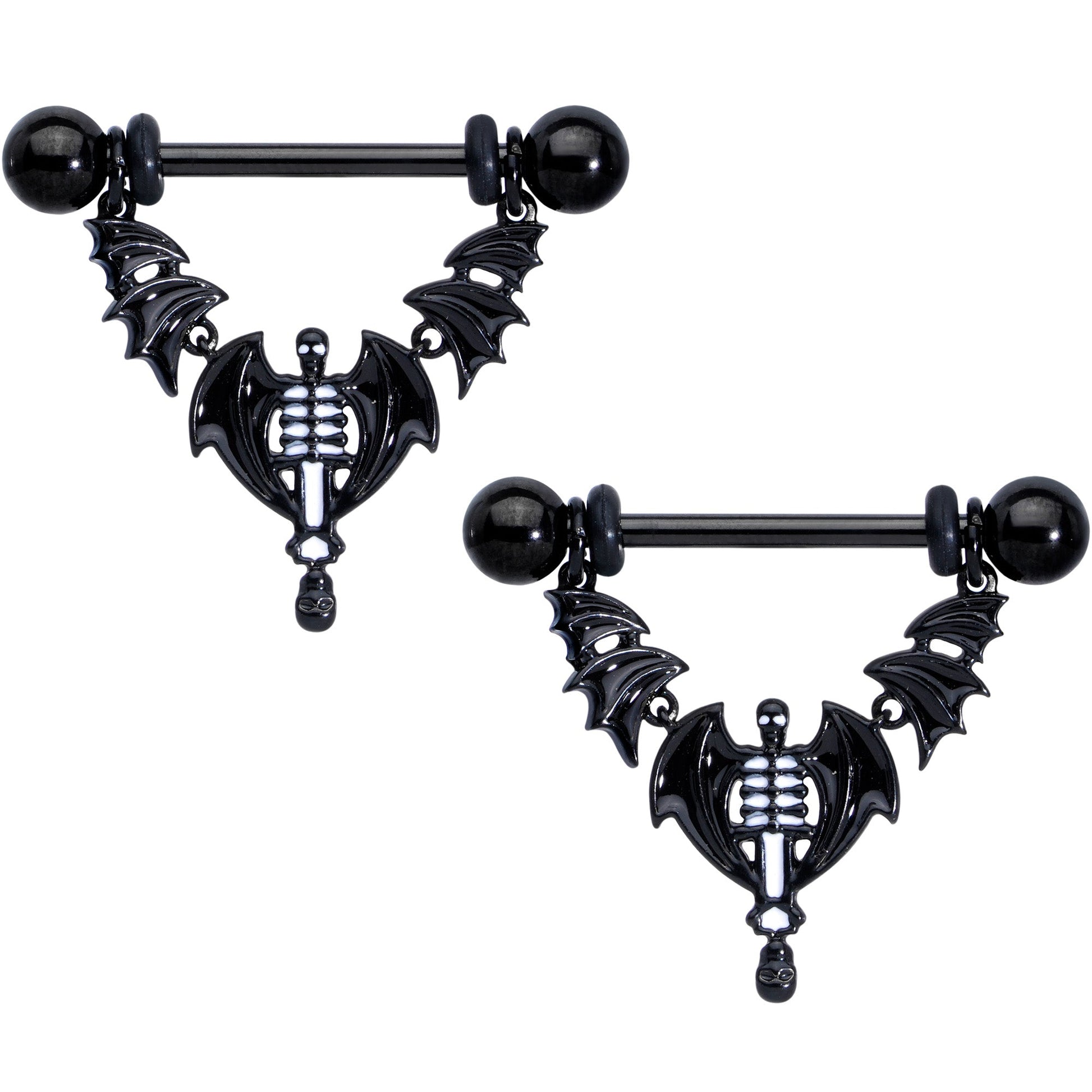 14G 9/16 Black Winged Skeleton Halloween Dangle Nipple Ring Set