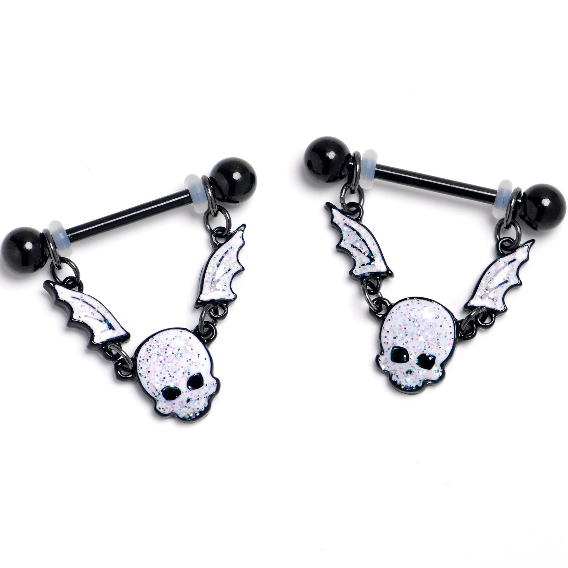 14 Gauge 9/16 Black Winged Skull Glitter Dangle Nipple Ring Set
