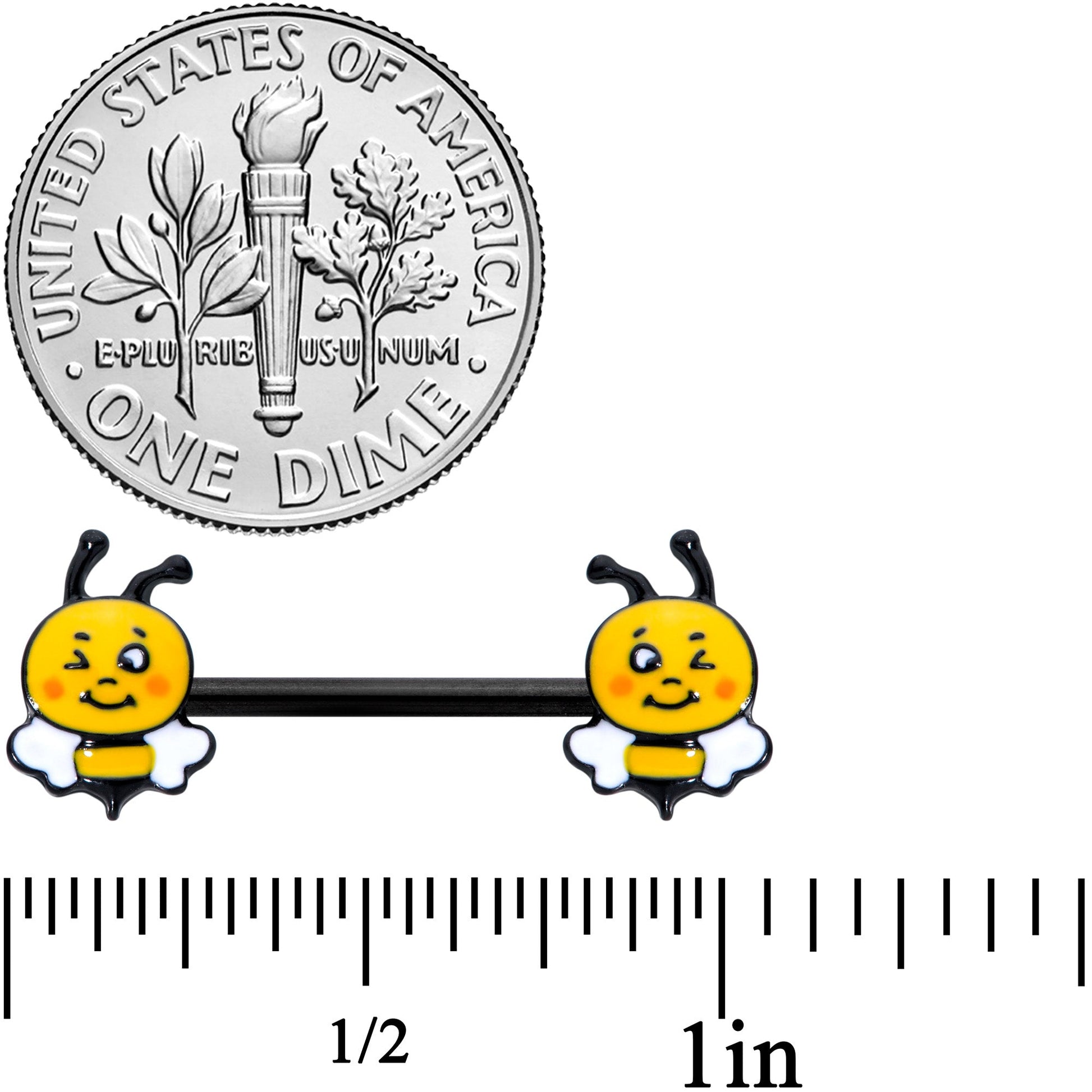The happy little bees on this 14 gauge nipple jewelry seem to be keeping a secret! They're made with 14mm black plated over 316L surgical grade stainless steel straight barbells. The ends feature bee charms, in their traditional black and yellow with white wings. The bees have cheerful smiles and are giving a little wink. They even have tiny antennae for an added touch of whimsy. Whether or not your piercings are a secret, these bees will never tell! Sold as a set of two.Specifications