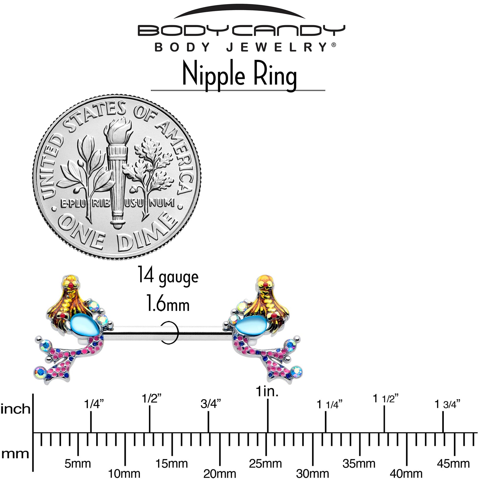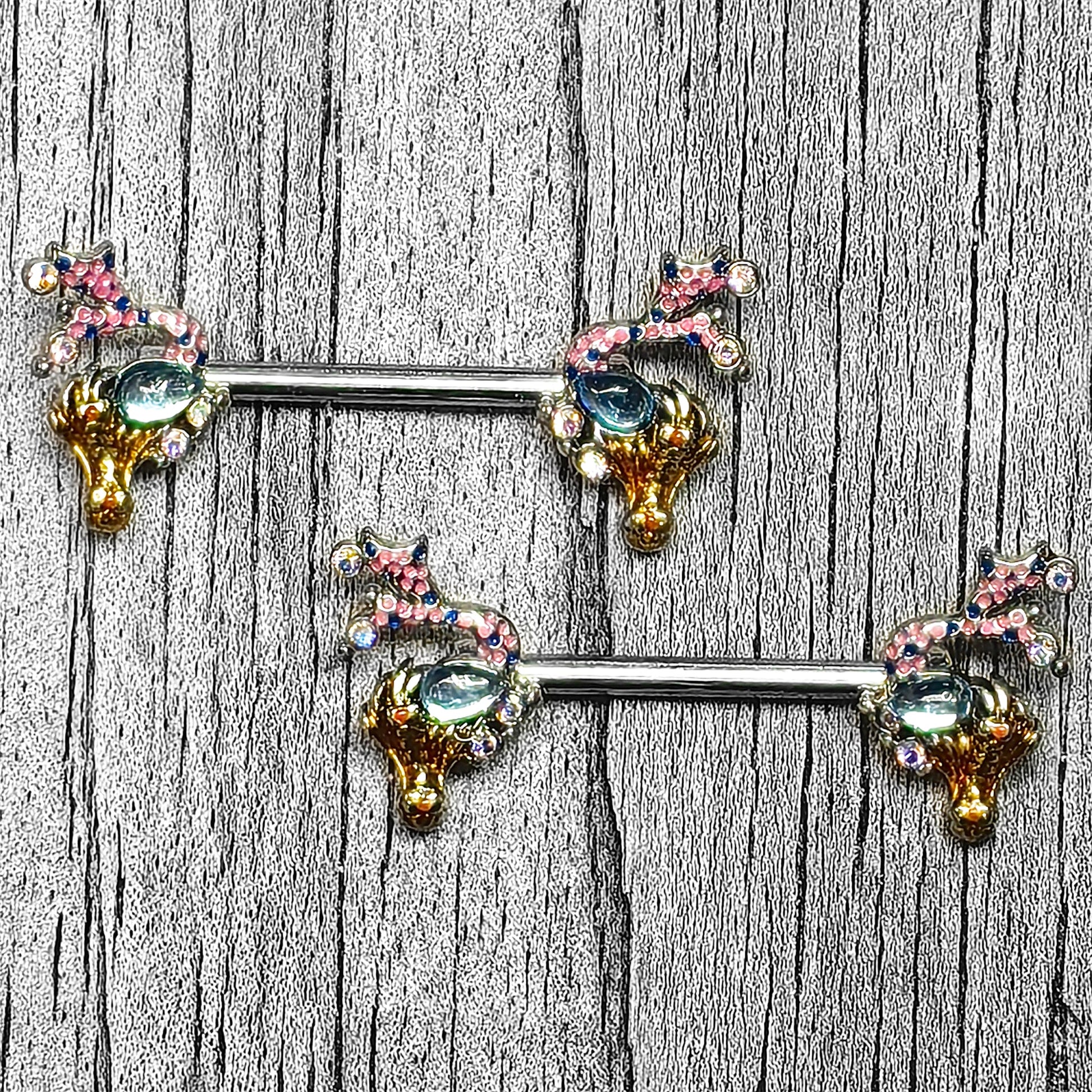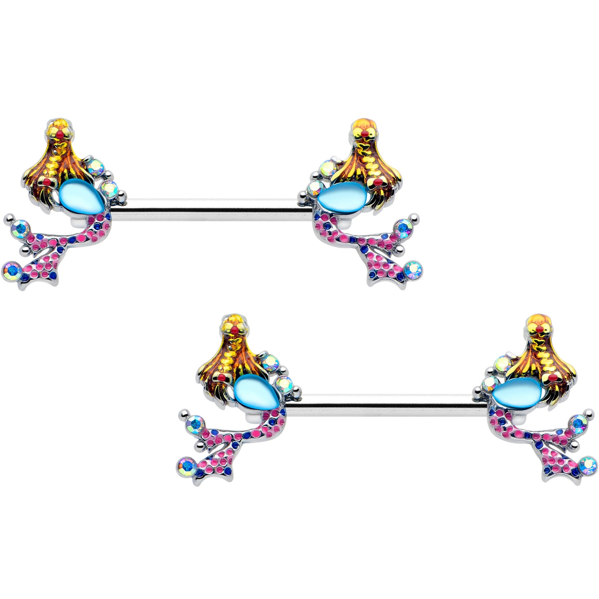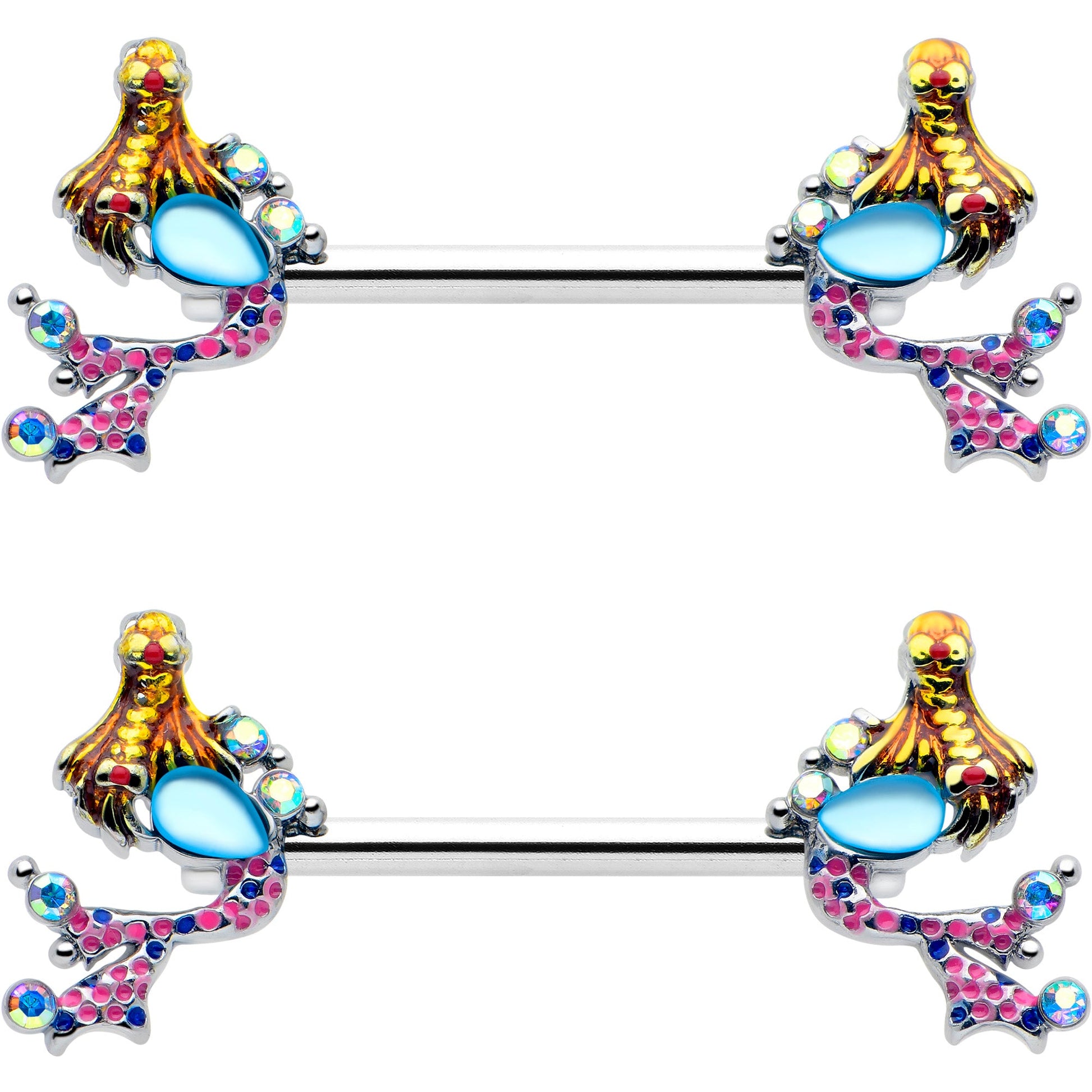 Get abstract and aquatic with this 14 gauge nipple jewelry. It is made with 14mm durable 316L surgical grade stainless steel straight barbells. Each of the ends features a mermaid charm, with abstract styling and aurora gem embellishments. They are each holding a blue gem, like treasure, and their tails are inlaid in pink and blue, with aurora gems at the ends. Swim in style with these marvelous mermaid nipple piercing rings. Sold as a set of two.Specifications
