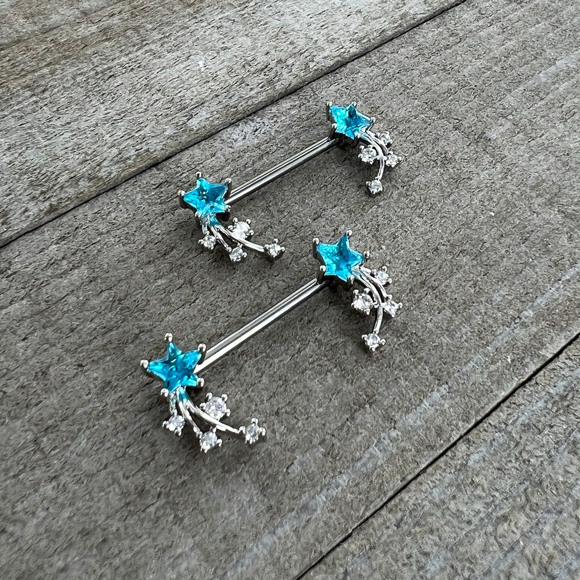14G 9/16 Blue Clear CZ Gem Shooting Star Barbell Nipple Ring Set