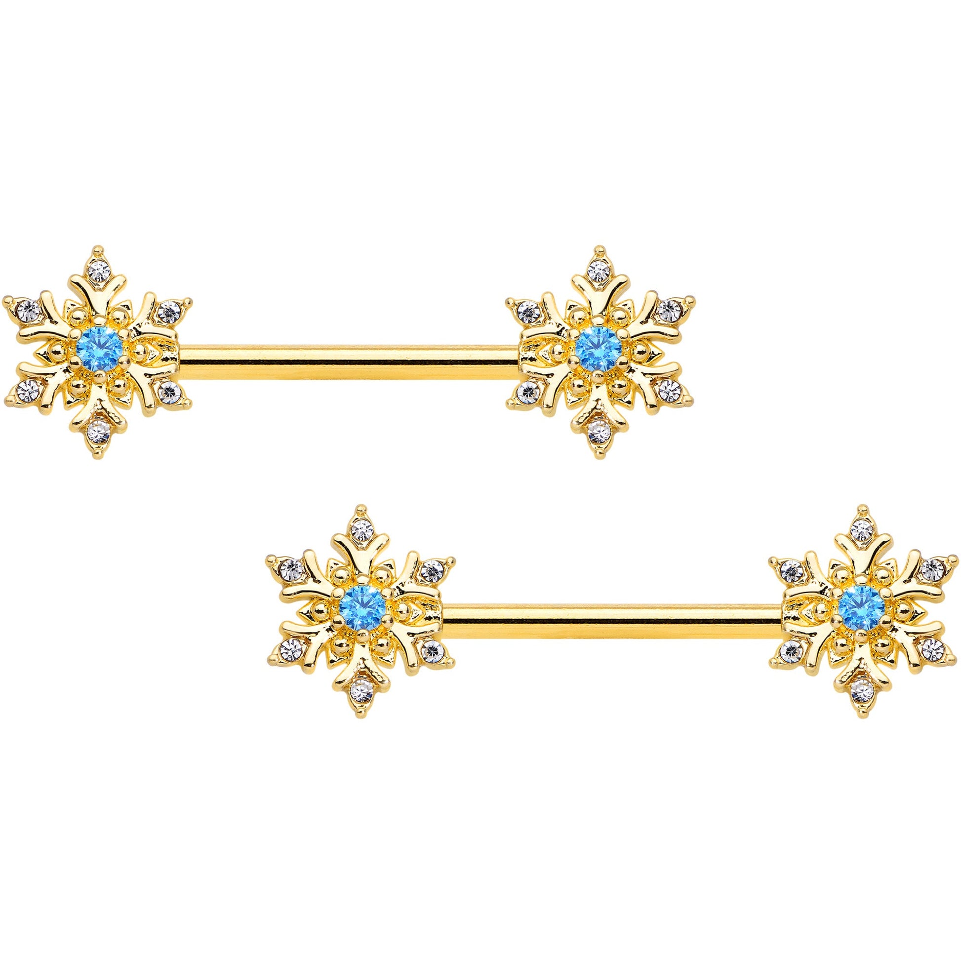 Let it snow all it wants this holiday with this 14 gauge nipple jewelry! It's made with 14mm gold tone PVD over 316L surgical grade stainless steel straight barbells. The ends each feature a snowflake charm set with clear gems and a blue cubic zirconia gem at the center for a lavish appearance. Make cocoa, light a fire, and get cozy - these sumptuous snowflakes let you love winter during the Christmas season and all year round! Sold as a set of two.Specifications