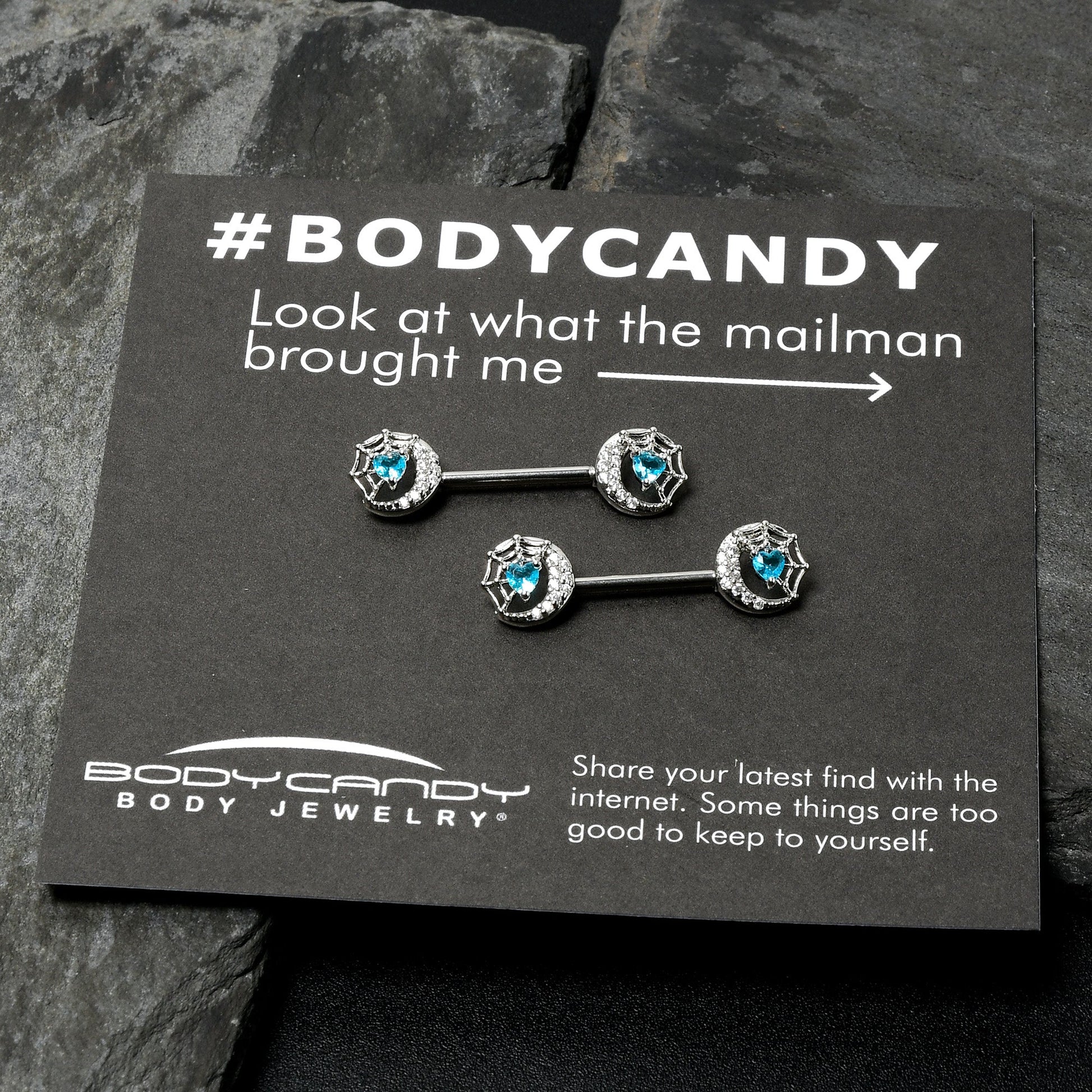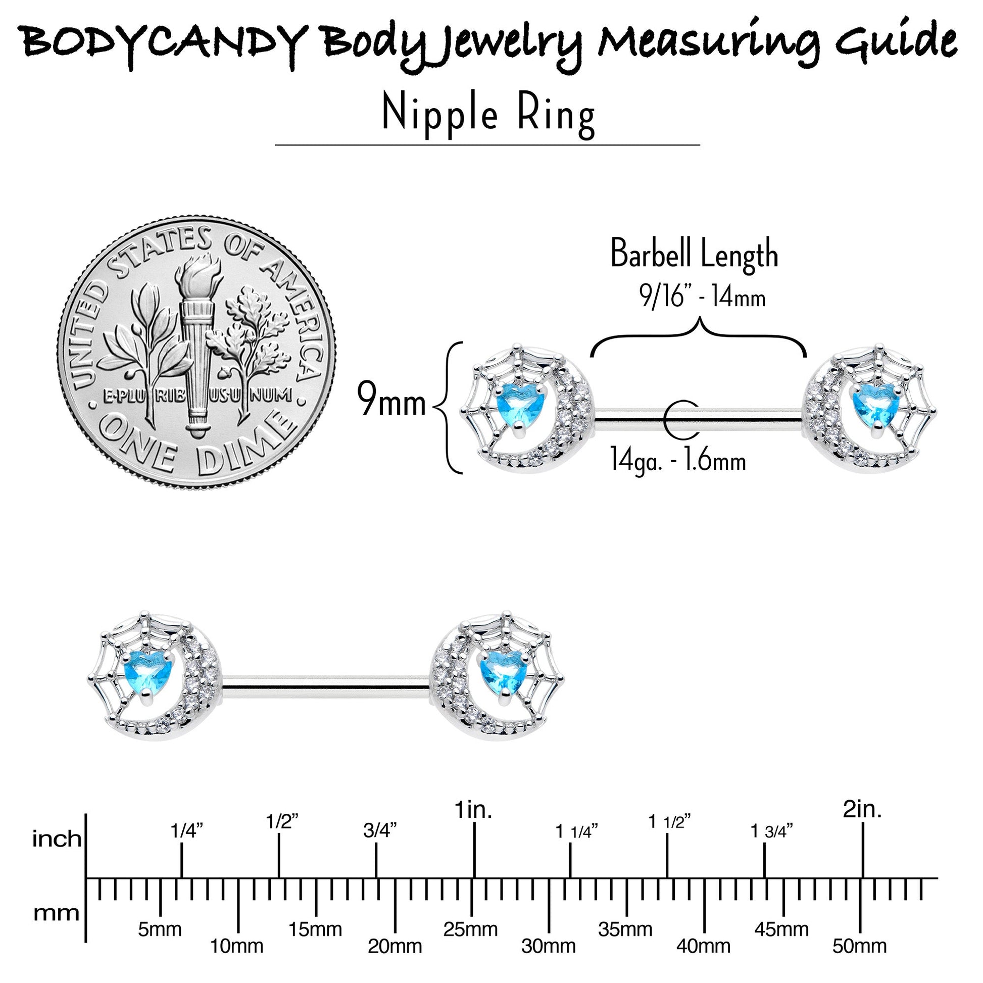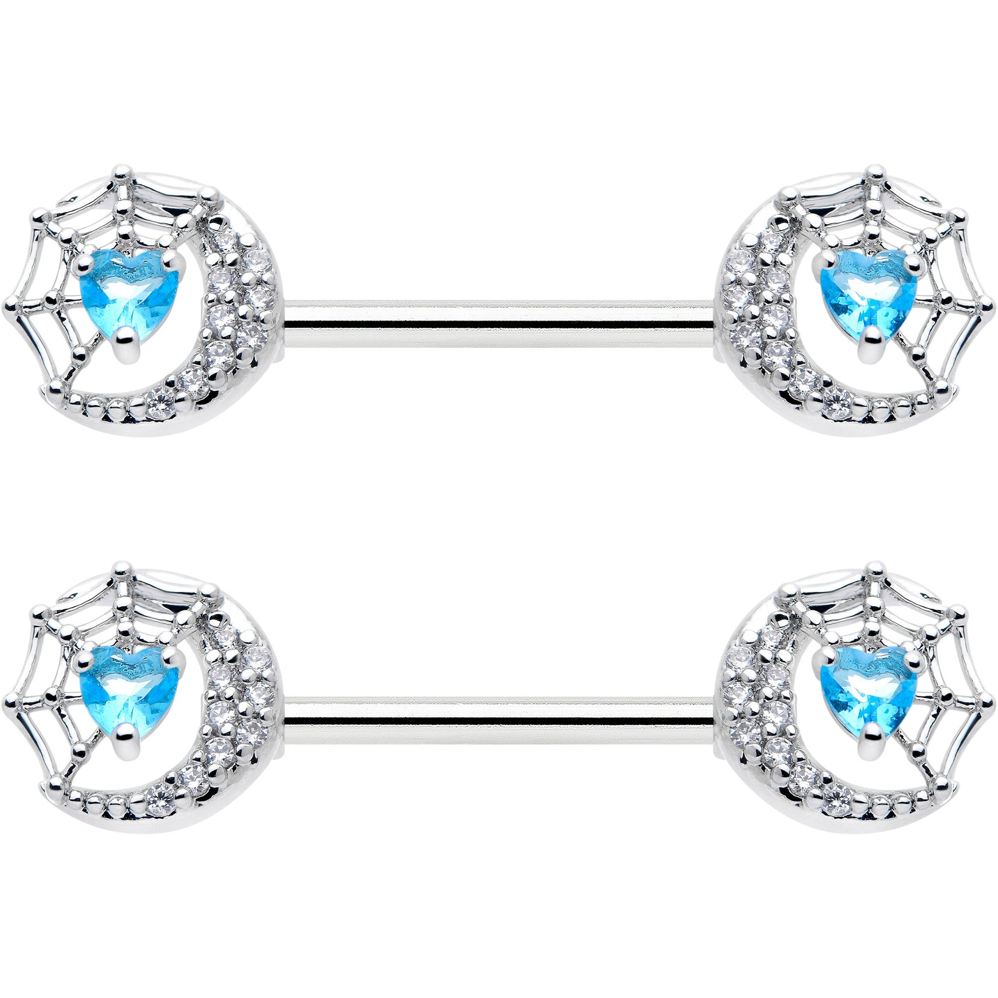 14 Gauge 9/16 Blue CZ Gem Heart Web Moon Barbell Nipple Ring Set