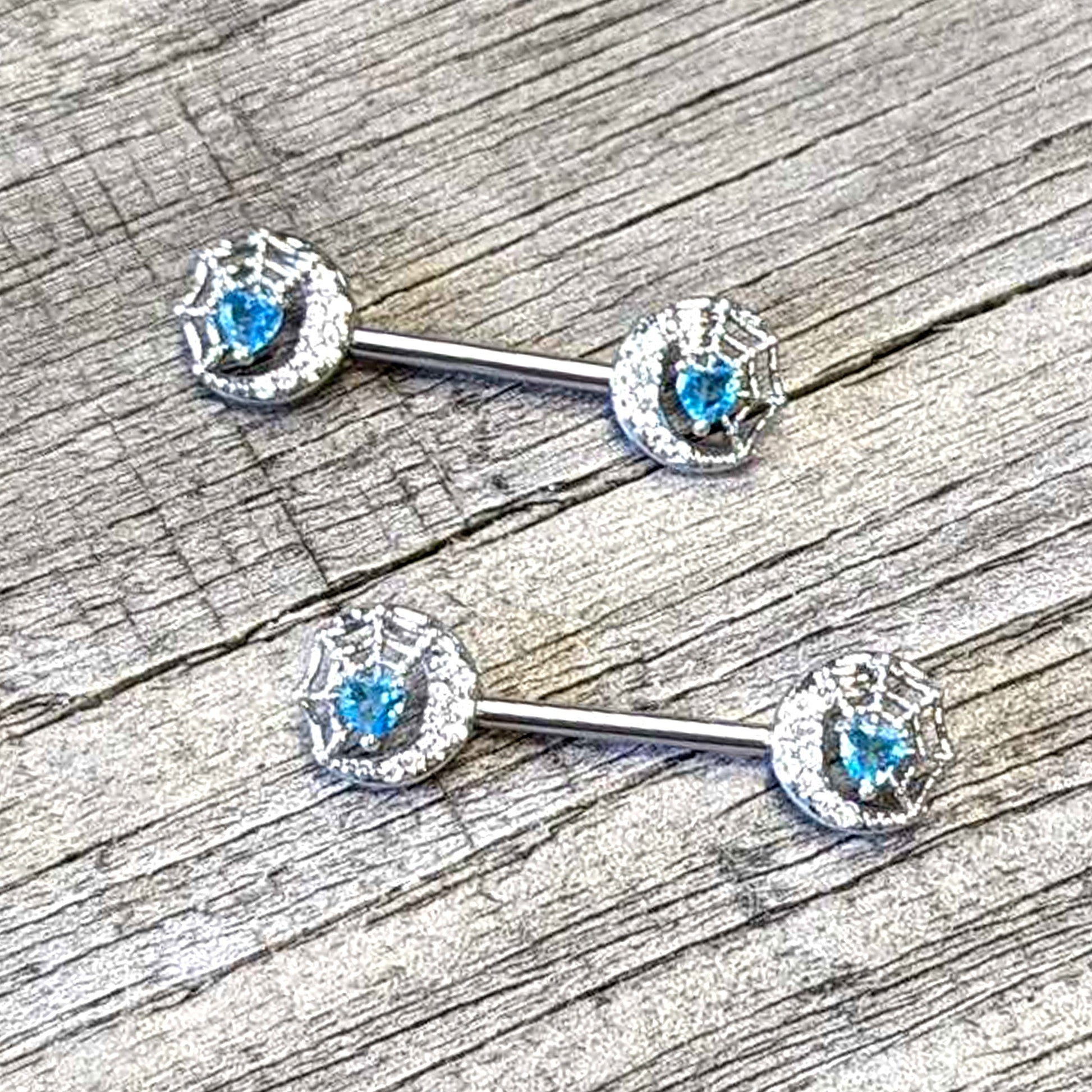If you are a creature of the night, show it off with this 14 gauge nipple jewelry. It is made with 14mm durable 316L surgical grade stainless steel straight barbells. Each of the ends features a crescent moon charm, set with clear cubic zirconia gems. The ends of the moon are connected with a spiderweb detail, which is set in the center with a heart shaped blue cubic zirconia gem. For gothic glamour, these nipple piercing rings cannot be beat. Sold as a set of two.Specifications