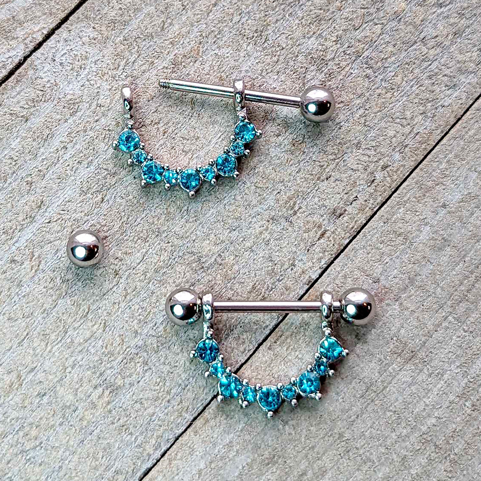 Party like it's your birthday all year long when you are rocking this 14 gauge nipple jewelry. It is made with 14mm durable 316L surgical grade stainless steel straight barbells with 5mm ball ends. Each one features a dangle arch design composed of blue cubic zirconia gems that emulate the birthstone for the month of March. Get festive and fabulous all year long with these charming nipple piercing rings. Sold as a set of two.Specifications