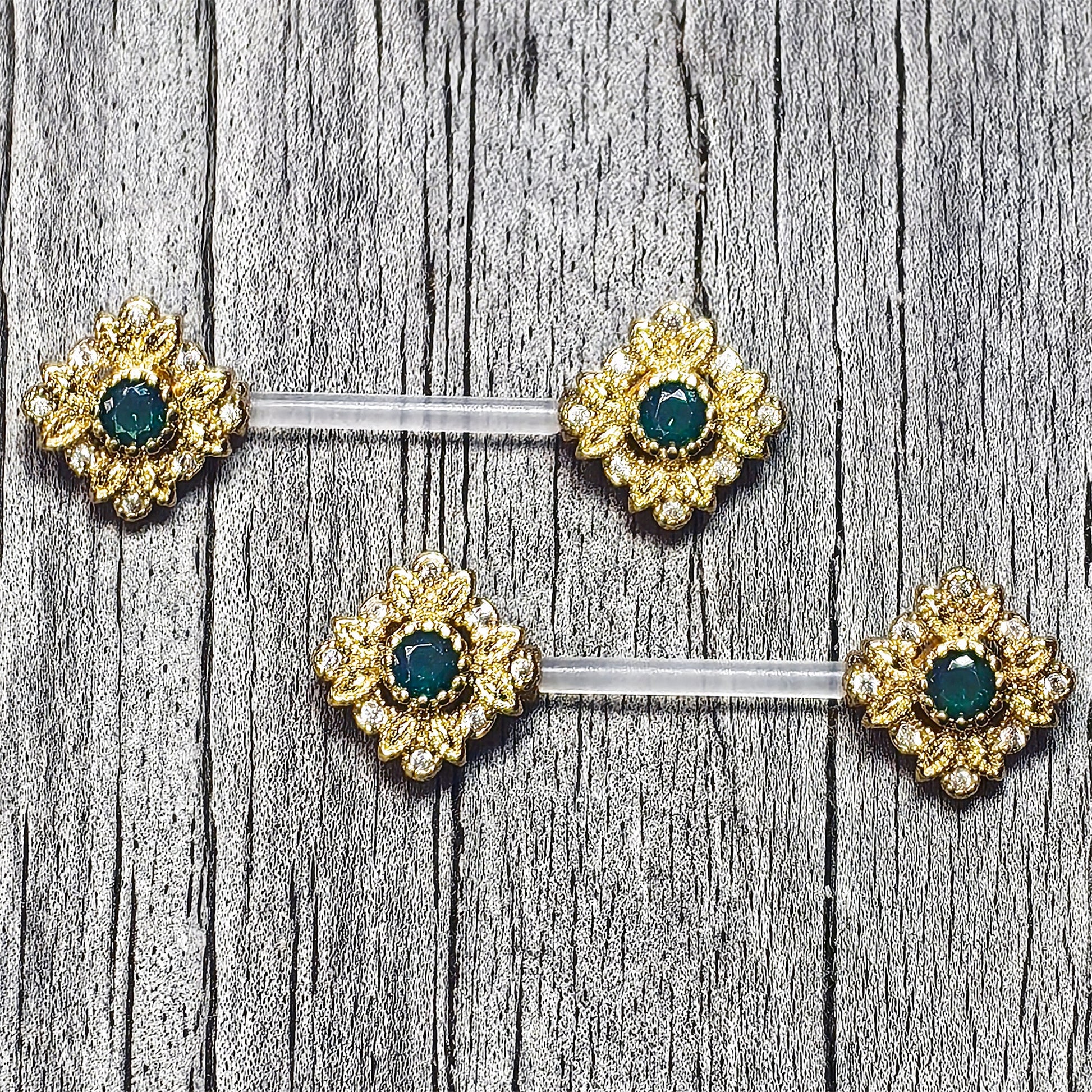 Take your nipple piercings back in time with this antique-inspired 14 gauge nipple jewelry. It is made with 14mm flexible Bioplast straight barbells. Each of the ends features a large, oval blue gem charm, set in a stylized golden tone rhombus that is embellished with clear gems for an elegantly retro appearance. Give an antique-inspired look to a modern piercing with this Art Deco styled nipple piercing jewelry. Sold as a set of two.Specifications