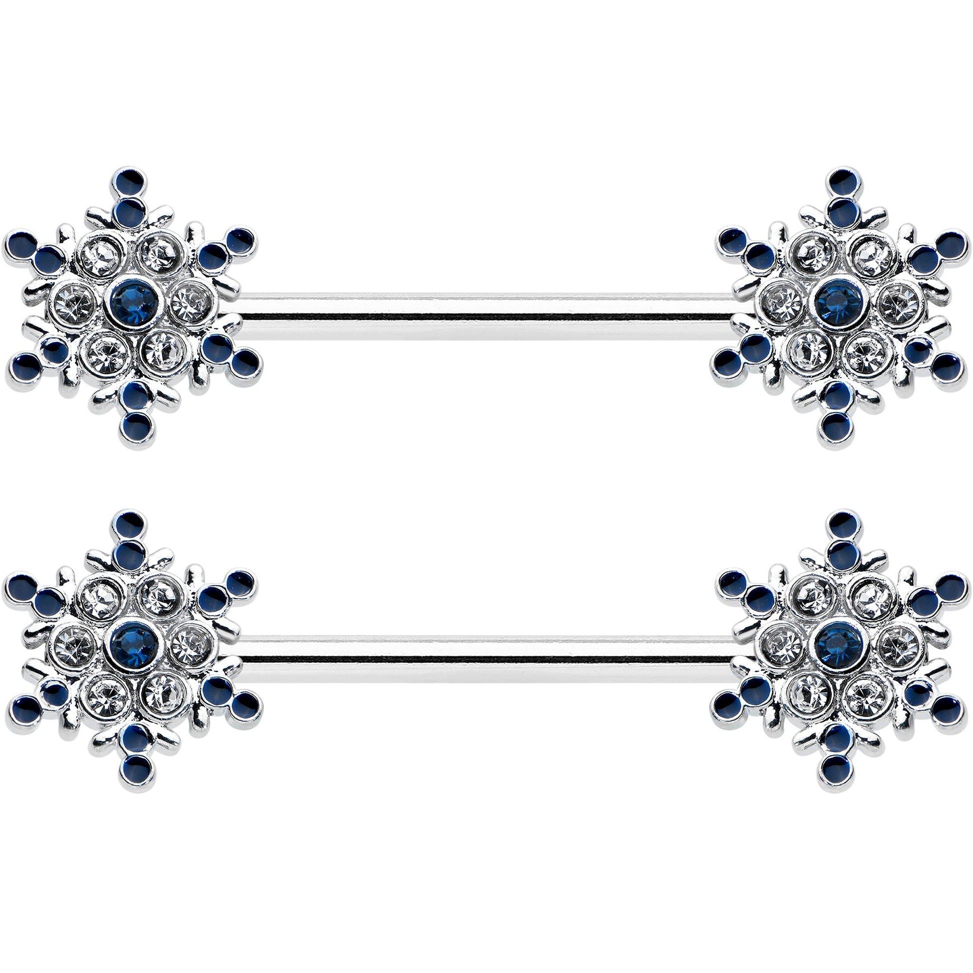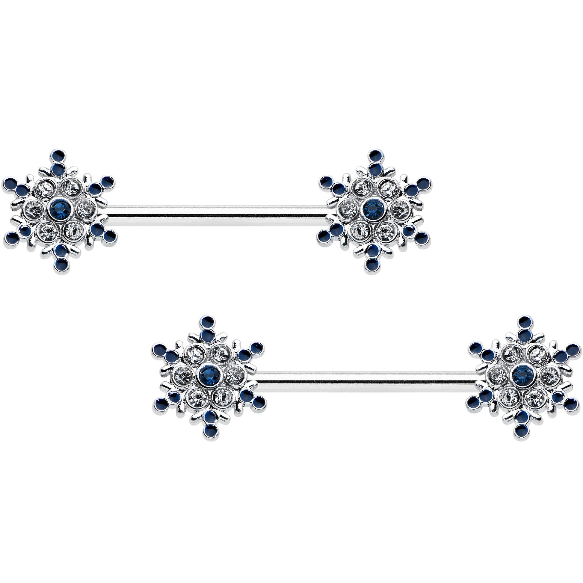 The snowflakes on this 14 gauge nipple jewelry are ones that you'll never let melt away from you whether it's Christmas or not! It's made with 14mm durable 316L surgical grade stainless steel straight barbells. Each of the ends features an intricate snowflake charm set with clear gems as well as deep blue gems at their centers for a luscious touch of color you'll totally fall for! This winter, let the snow spruce up your nipple piercings with these sweet and sumptuous nipple piercing rings! Sold as a set of two.Specifications