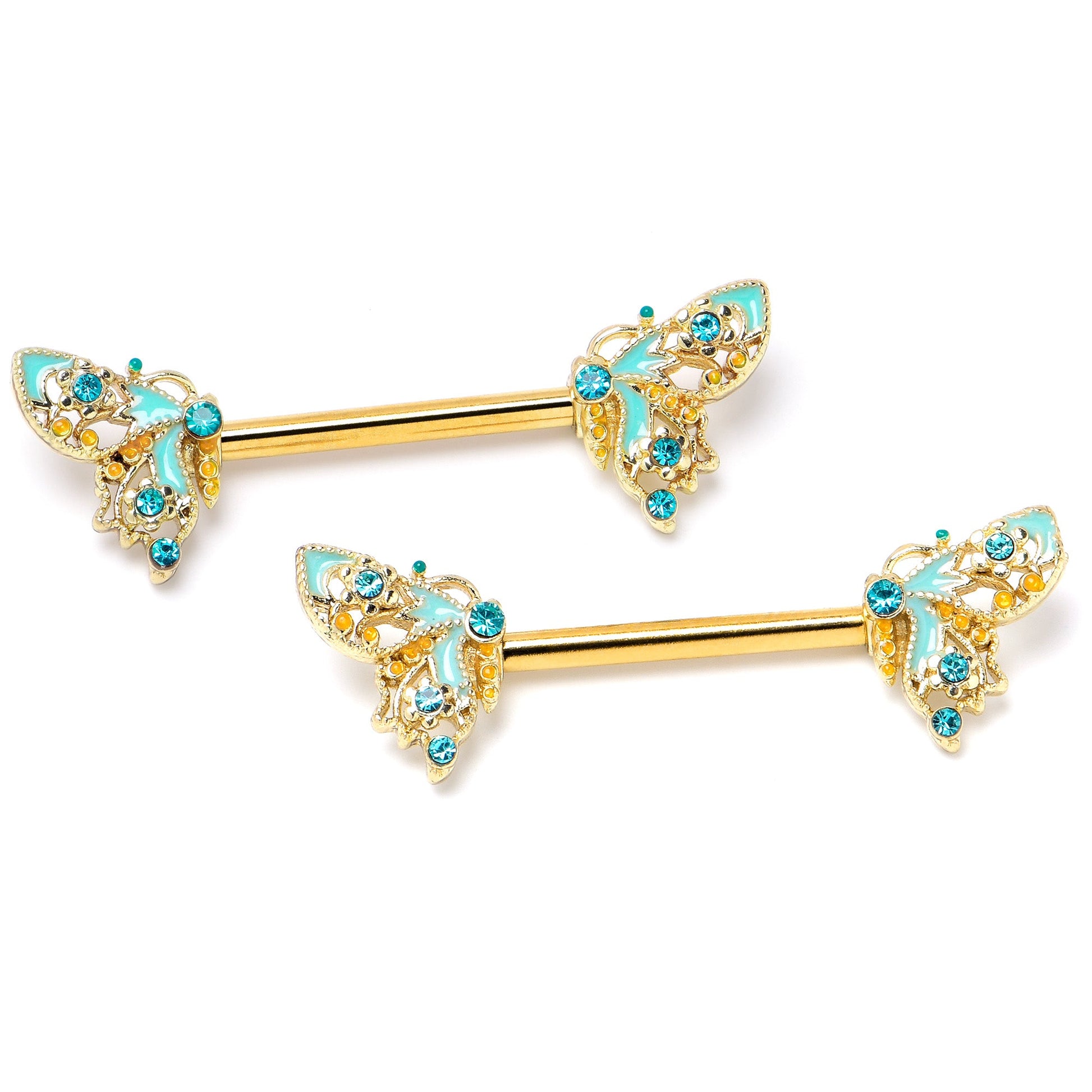 Spread your wings with this 14 gauge nipple jewelry. It is made with 14mm gold tone PVD over 316L surgical grade stainless steel straight barbells. Each of the ends features a butterfly charm, with intricate textured detailing and blue gem embellishments. They are further embellished with a ribbon design for a truly eye-catching look. Let your look soar with these elegantly styled nipple piercing rings. Sold as a set of two.Specifications
