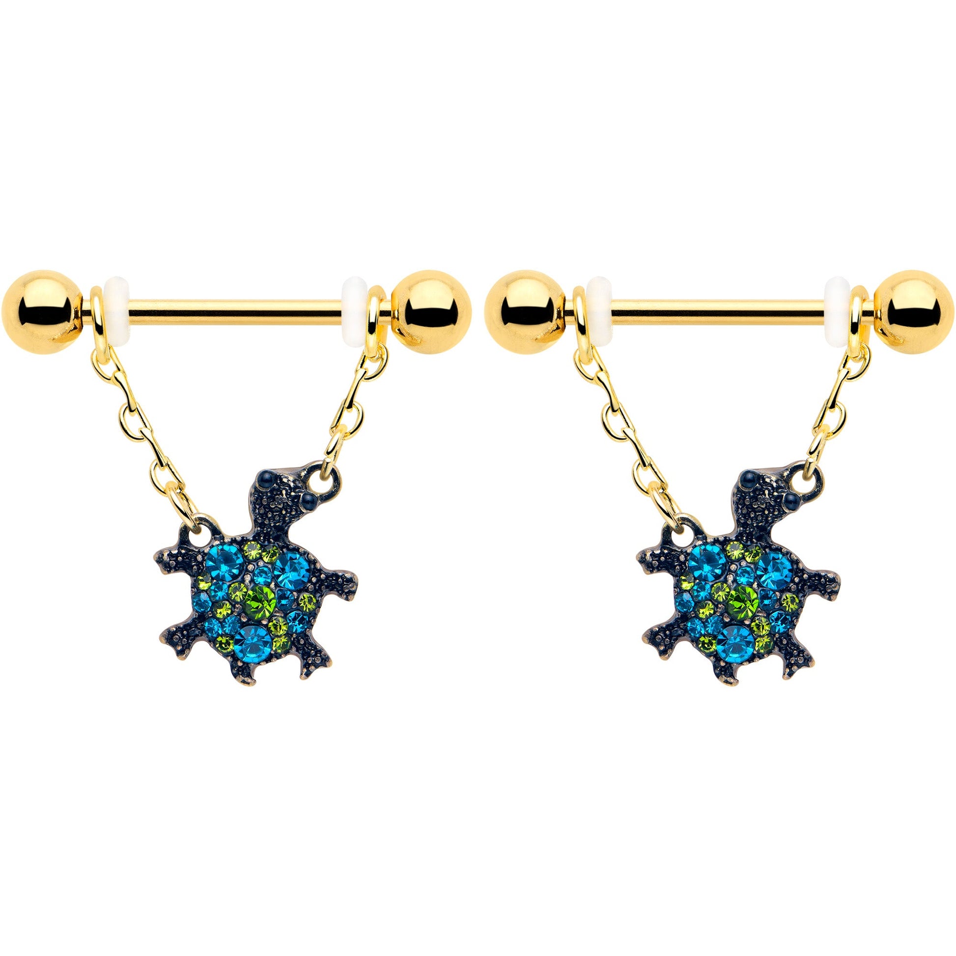 The turtles on this 14 gauge nipple jewelry are all decked out in glitzy style. It's made with 14mm gold tone PVD over 316L surgical grade stainless steel straight barbells with 5mm ball ends that each support a double length of matching chain. Each pair of chain supports a turtle charm, with blue and green gems set into its back, as well as textured detailing for added style. They even feature sweetly whimsical expressions on the turtles' faces for an added touch of whimsy. You will be swimming in style when you're rocking these colorful turtle nipple piercing rings. Sold as a set of two.Specifications