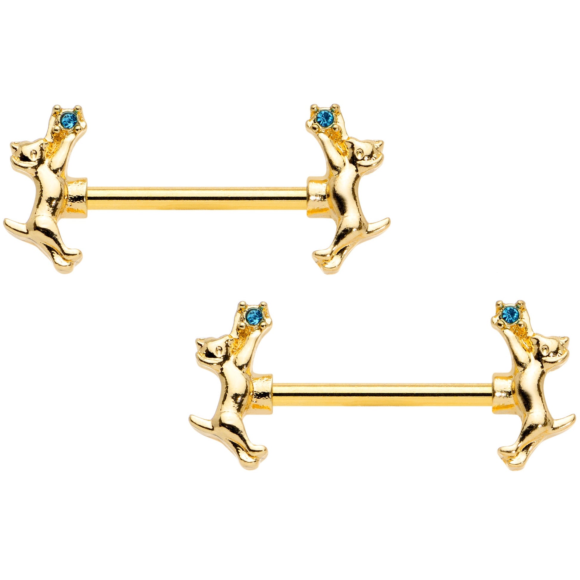 14G 9/16 Blue Gem Gold Tone Leaping Cat Barbell Nipple Ring Set