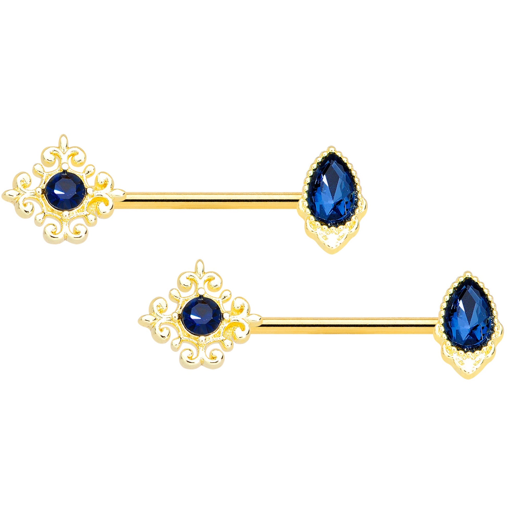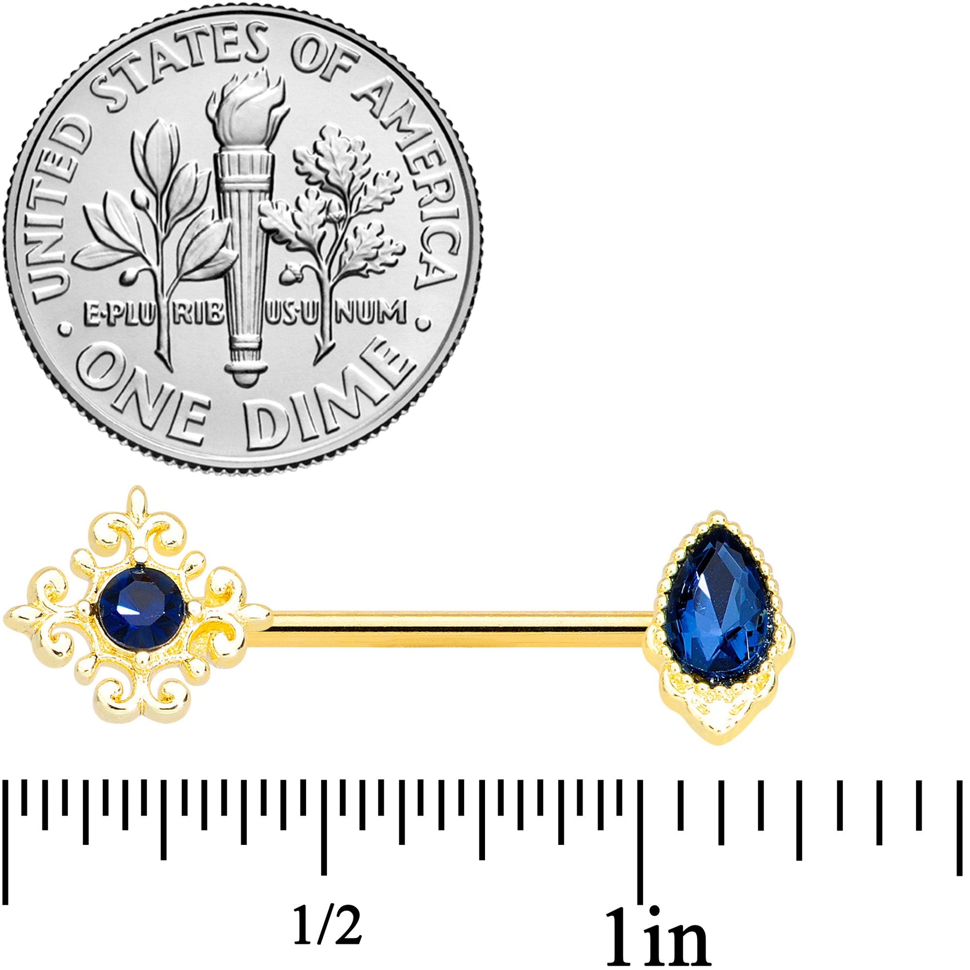 Give your nipple piercings a royal demeanor with this regal looking 14 gauge nipple jewelry! It's made with 14mm gold tone PVD over 316L surgical grade stainless steel straight barbells. One end features a cross with scrollwork arms, forming a rhombus shape. It's set at the center with a round dark blue gem. The other end features a dark blue gem in the shape of a with textured edging. And you can wear it with the ends facing upwards or downwards as you see fit. Sold as a set of two.Specifications