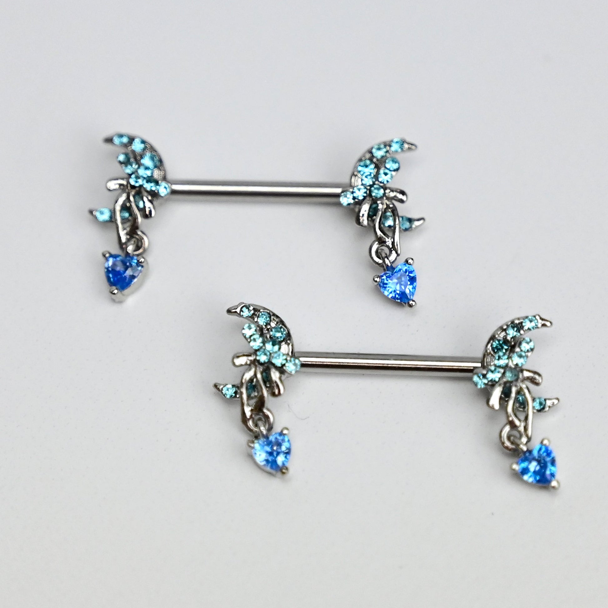 14G 9/16 Blue Gem Moon Bow Heart Dangle Nipple Ring Set