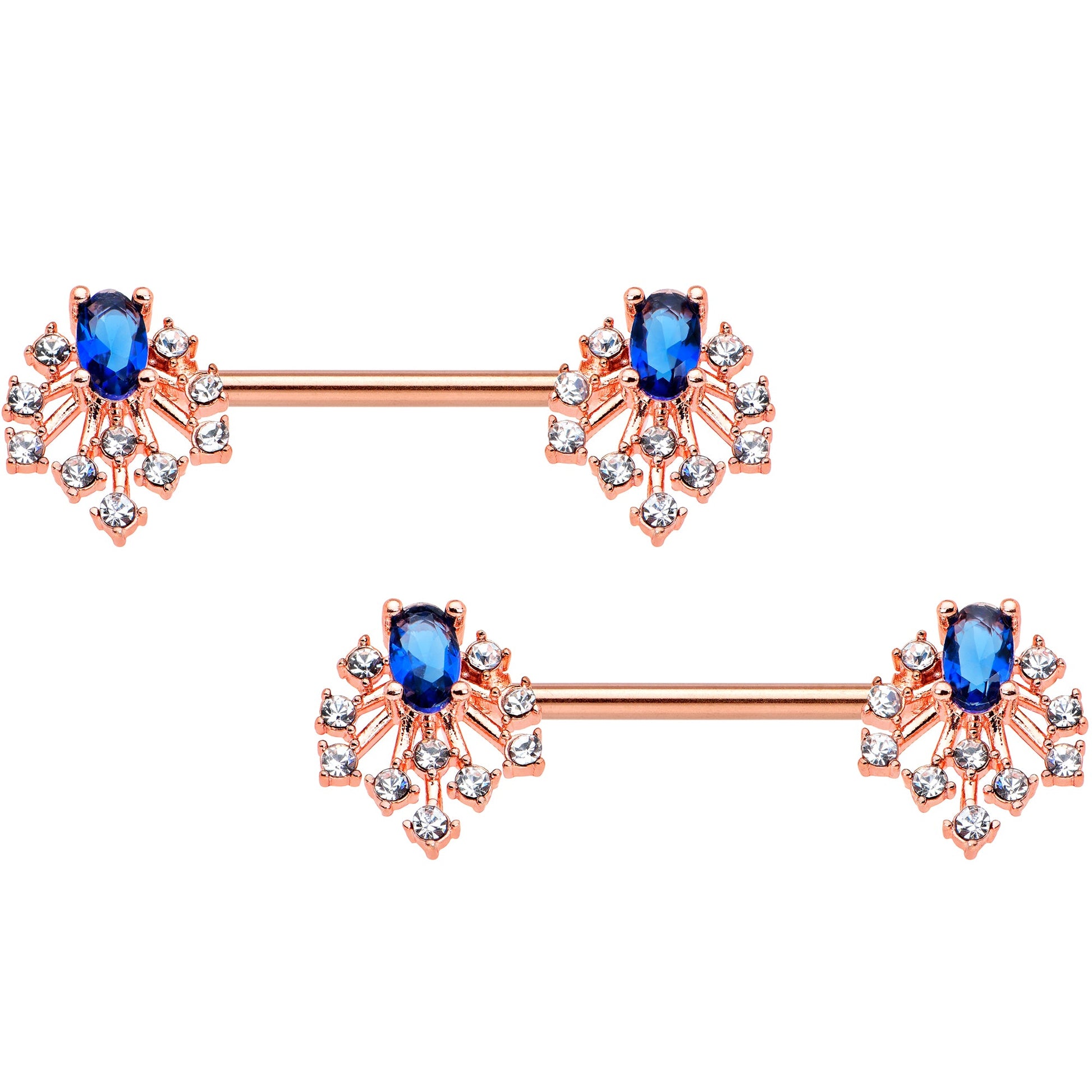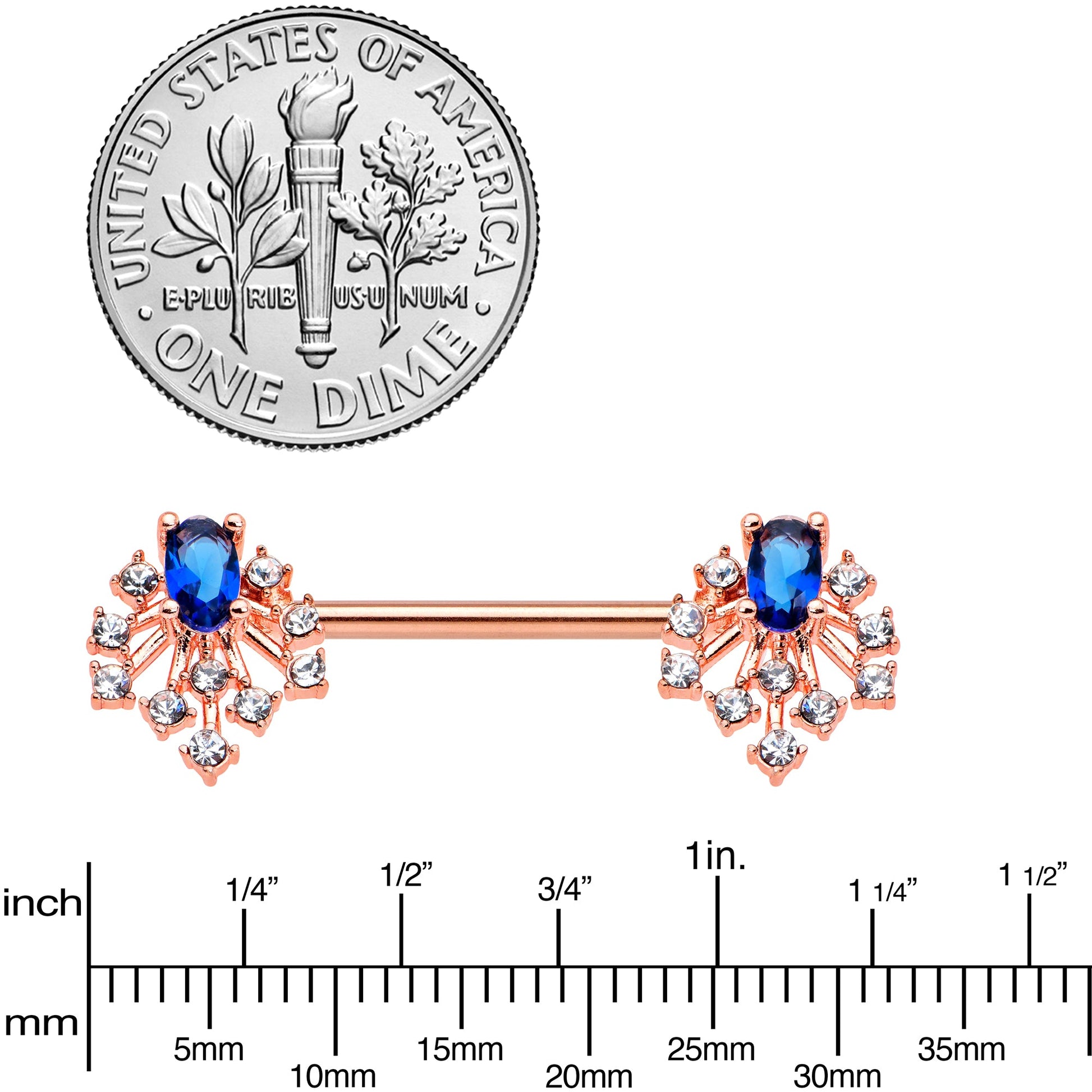 The flare on this 14 gauge nipple jewelry is going to add a ton of flair to your look! It's made with 14mm rose gold tone PVD over 316L surgical grade stainless steel straight barbells. Each of the ends features a blue gem charm, surrounded by rays tipped with clear gem ends for a firey look! You'll be enjoying a fashion flareup when you're rocking these colorful nipple piercing rings! Sold as a set of two.Specifications