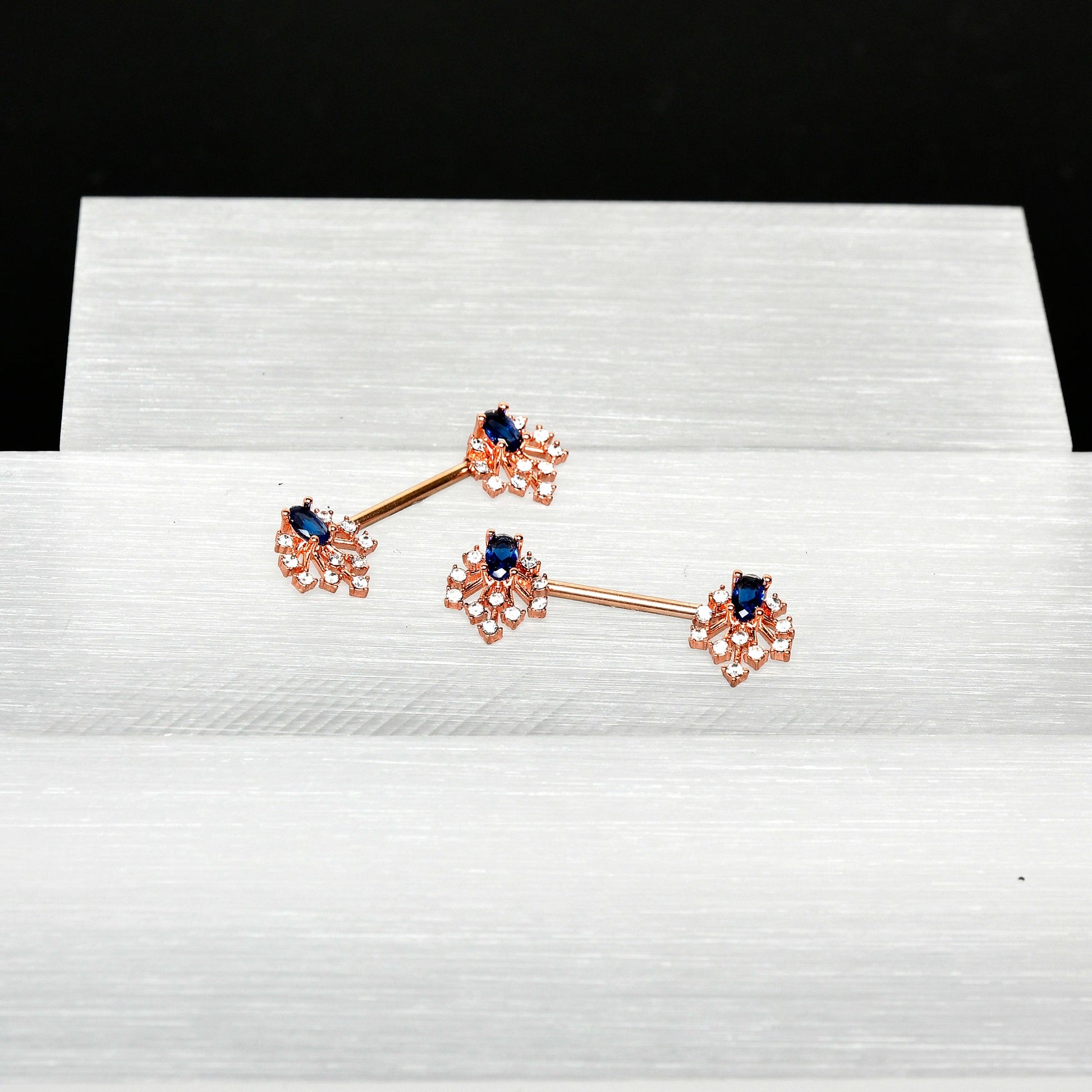 14 Gauge 9/16 Blue Gem Rosy Tone Glam Flare Barbell Nipple Ring Set