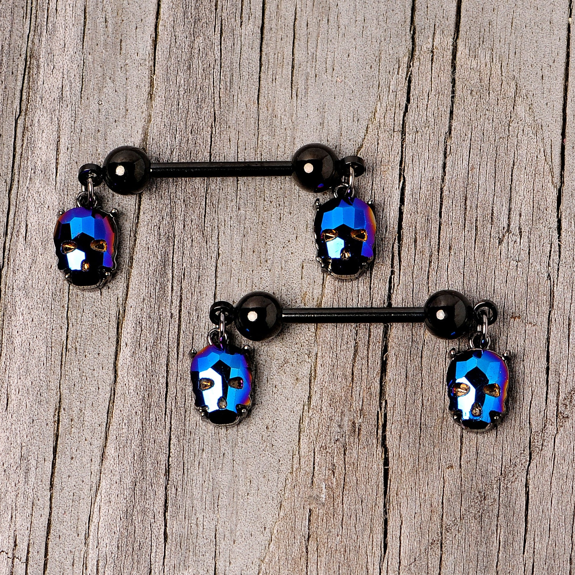 Creepy. cool, and totally captivating! These 14 gauge nipple rings are made with 14mm black PVD over 316L surgical grade stainless steel straight barbells with 5mm ball ends. Dangling from the ends are faceted forward-facing sugar skull charms composed of blue gems. They shift towards purple, adding even more visual interest. Perfect for Halloween, Dia de los Muertos, or any time you want to add some color to your nipple piercings! Sold as a set of two.Specifications