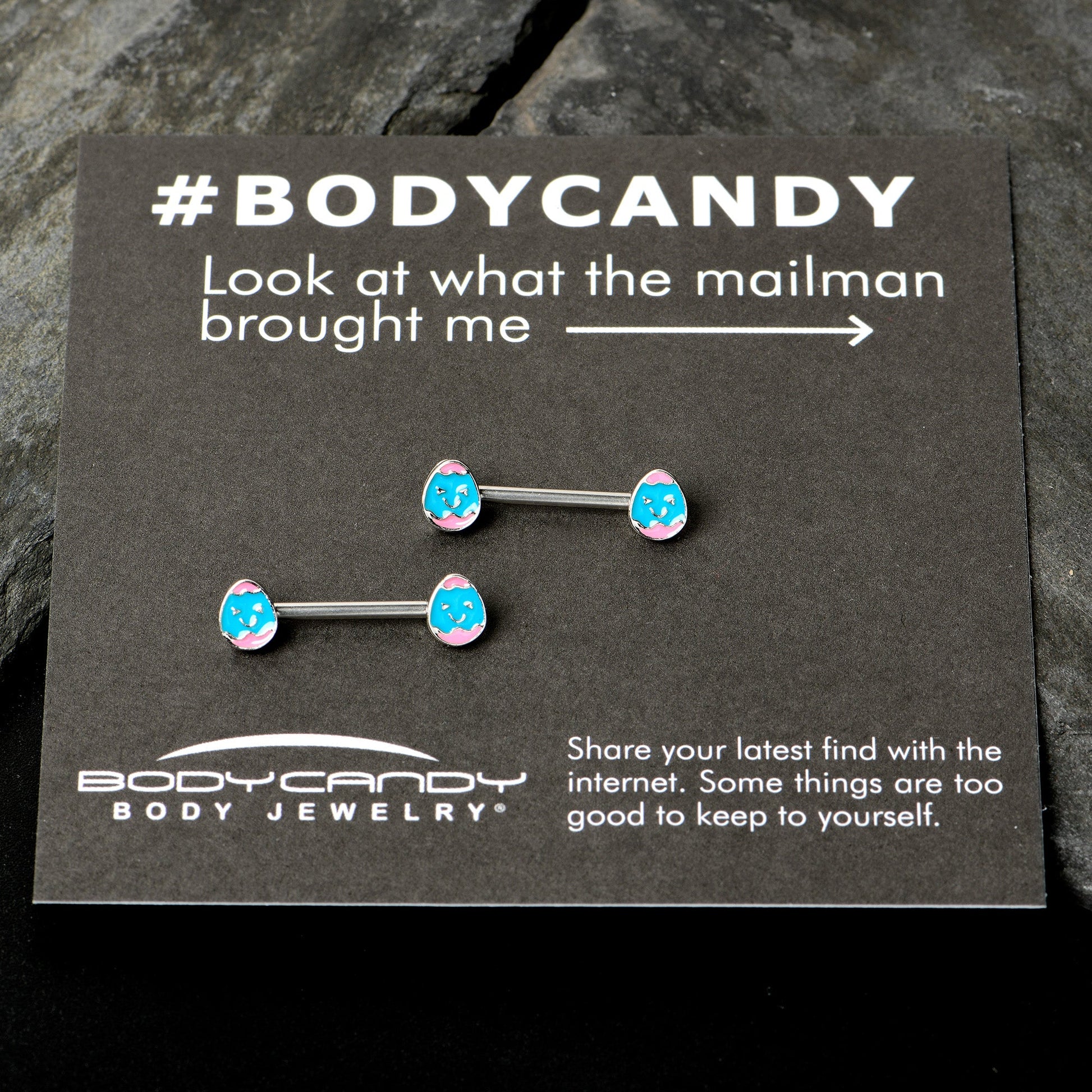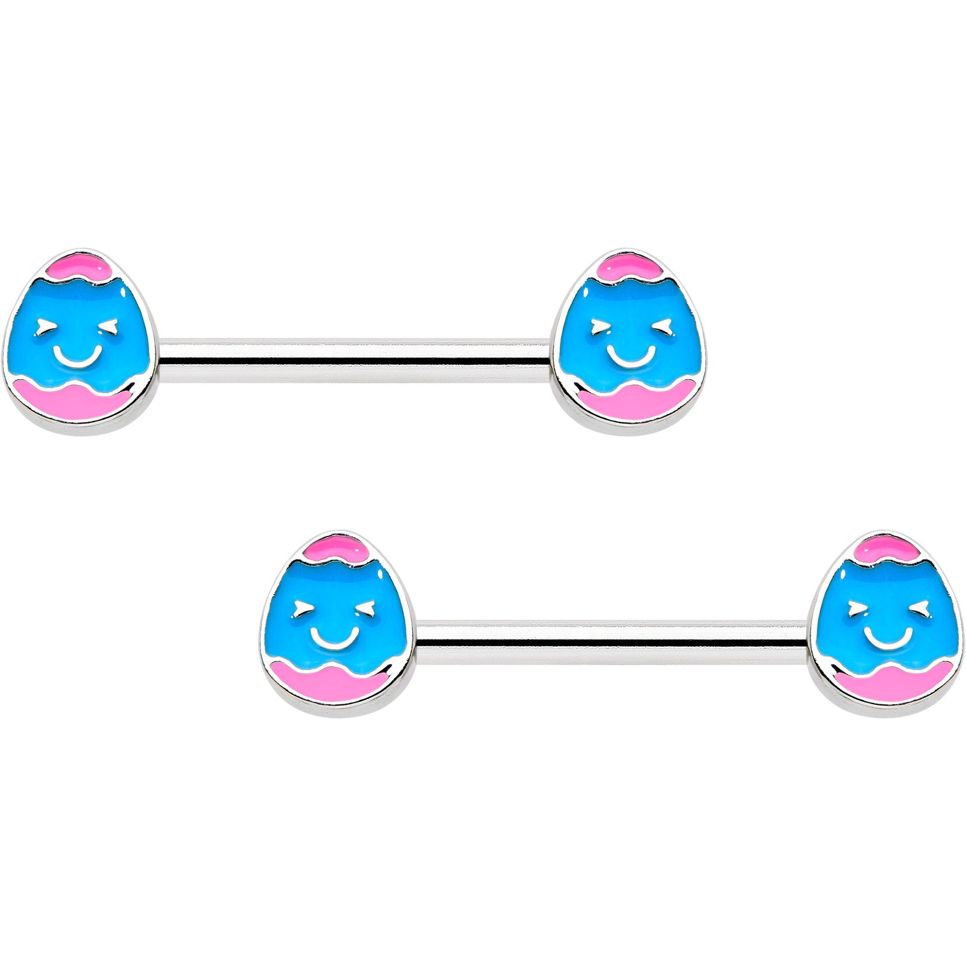 Get ready to hatch a new look for Easter with this 14 gauge nipple jewelry! It's made with 14mm durable 316L surgical grade stainless steel straight barbells. Each of the ends features a blue Easter egg charm, with a cheerful smiling face. The eggs are further embellished with pink ends for a festive touch of color. You won't have to hunt for kawaii style body jewelry for Easter when you're rocking these Easter egg nipple piercing rings! Sold as a set of two.Specifications