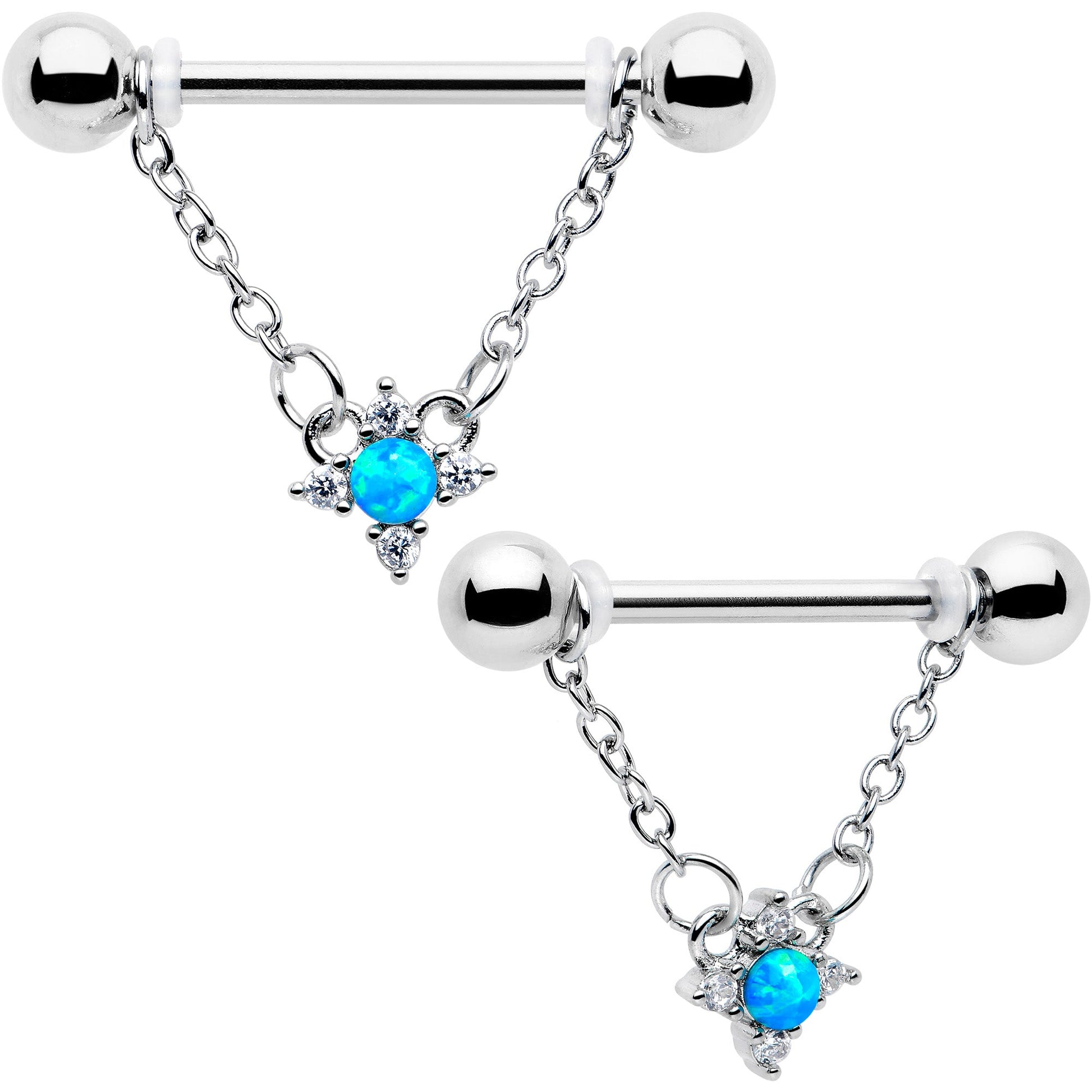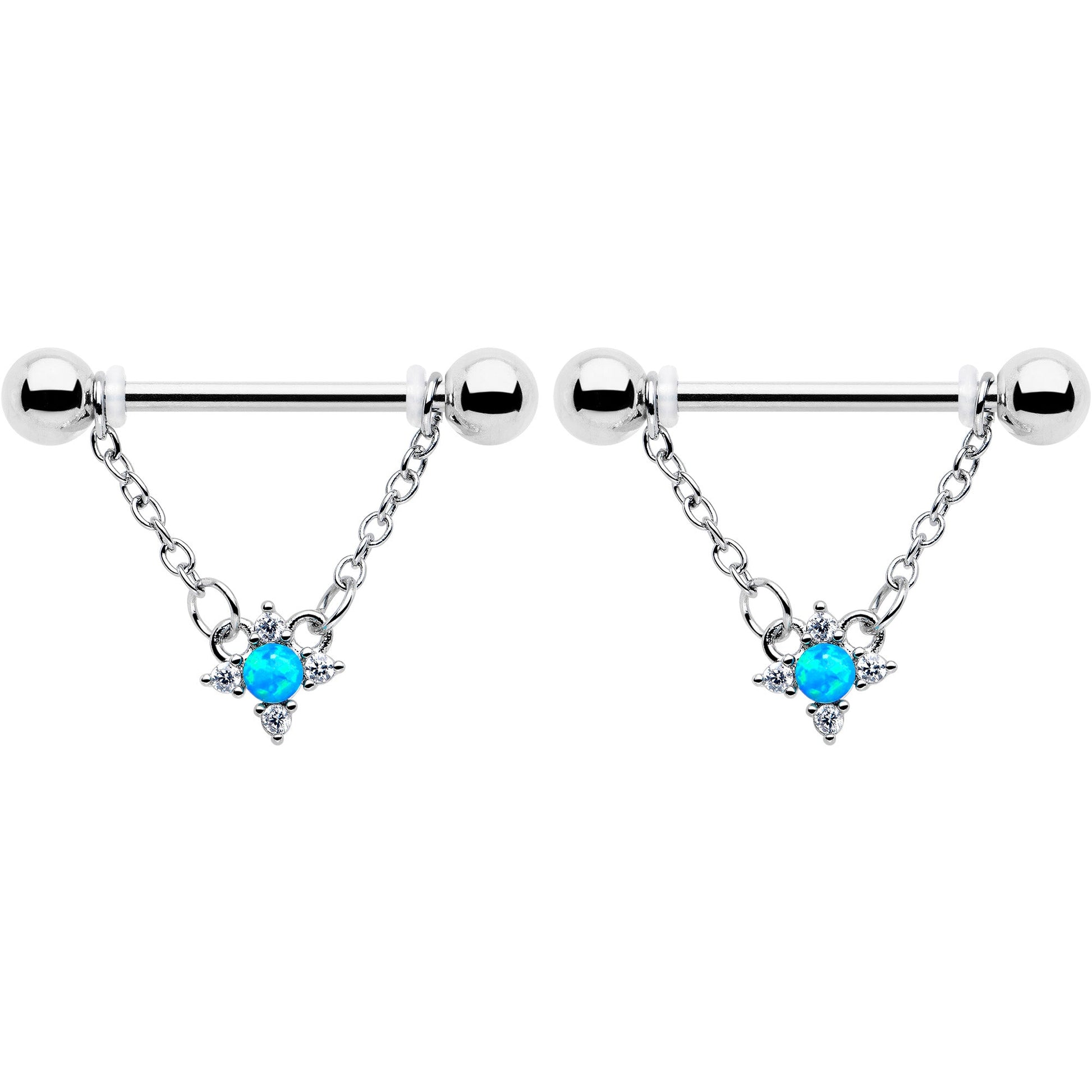 You'll feel like a star when you're rocking this 14 gauge nipple jewelry. It's made with 14mm durable 316L surgical grade stainless steel straight barbells with 5mm ball ends and each one supports a double length of matching chains. Each pair of chains supports an elegant star charm, with clear cubic zirconia gems set in each of the points. The stars are each set with a blue synthetic opal at the center for a color contrast you can't take your eyes off of. Look as regal as you feel with these elegant celestial nipple piercing rings. Sold as a set of two.Specifications