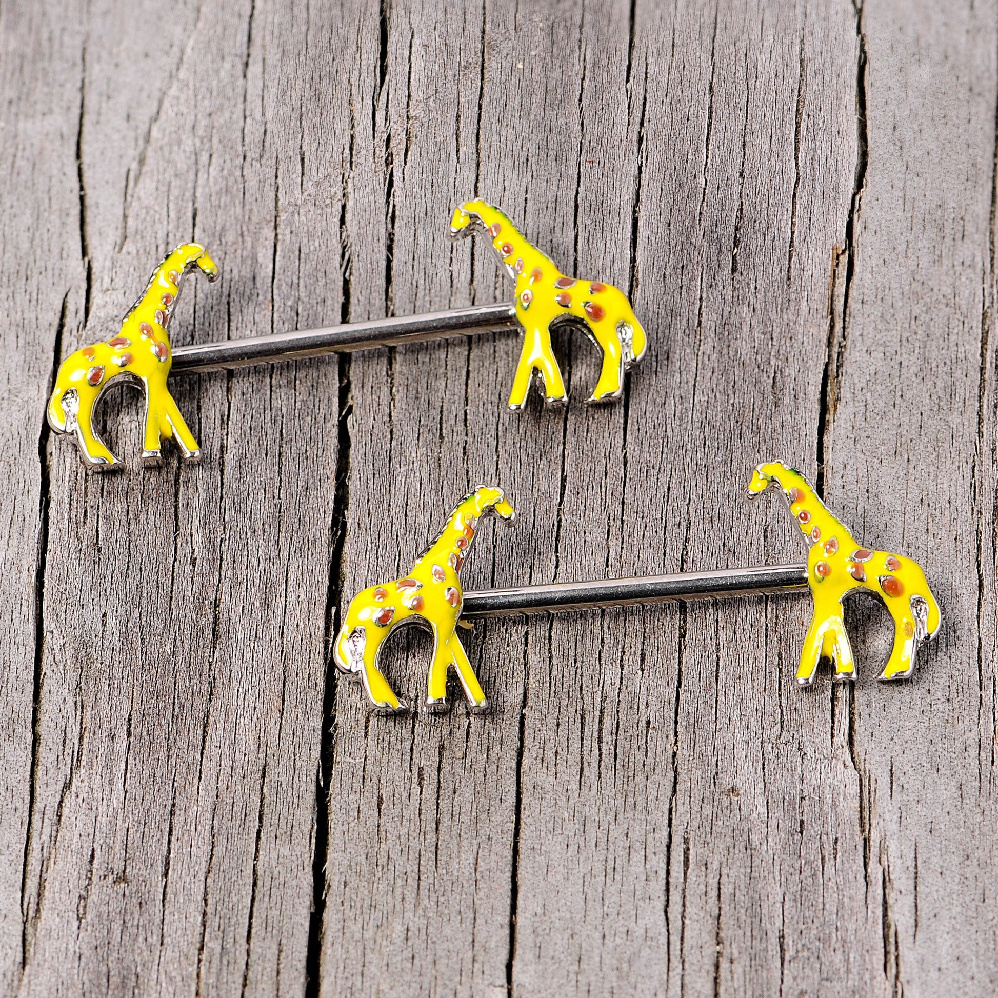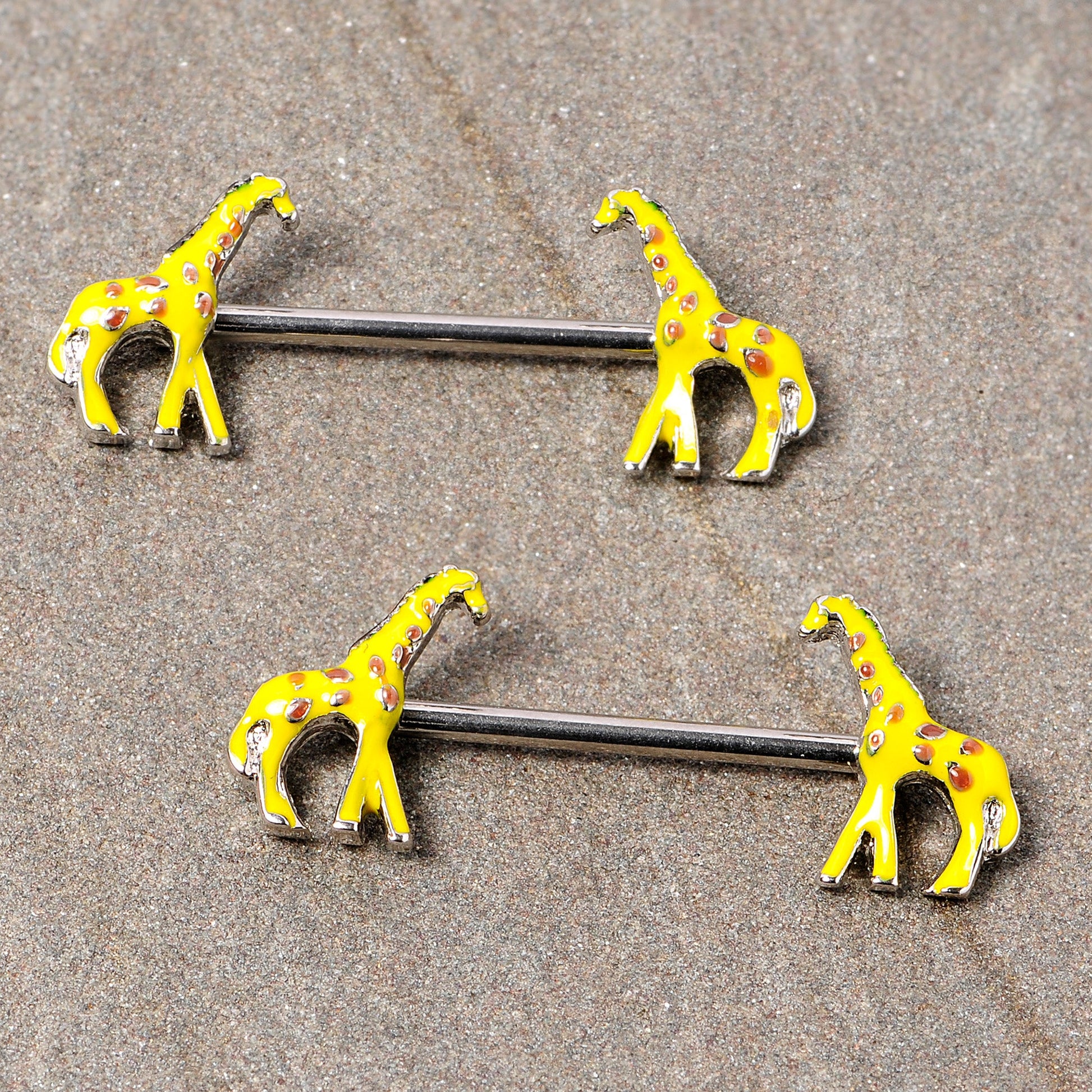 It's hard not to love an animal that's so big and so gentle. So why not pay tribute to this gentle giant with this 14 gauge nipple jewelry? It's made with 14mm durable 316L surgical grade stainless steel straight barbells. The ends feature giraffe charms in bright yellow with realistic brown spots. Let your nipple piercings proclaim your love for a beautiful mammal that could use our support. Sold as a set of two.Specifications