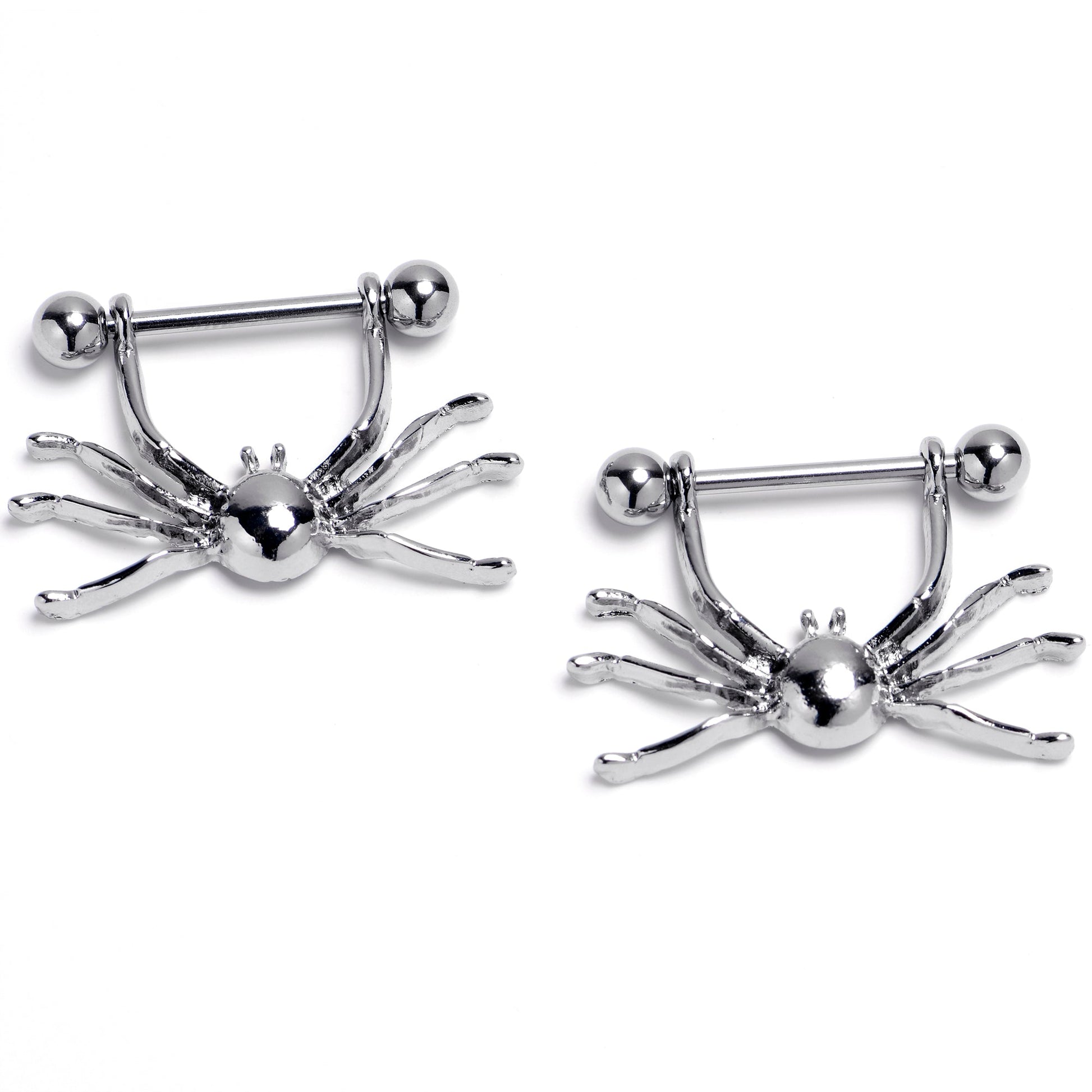 The spiders on this 14 gauge nipple jewelry are hardly eensy weensy! It's made with 14mm durable 316L surgical grade stainless steel straight barbells with 5mm ball ends. The shield portions feature matching spider charms, with individually defined legs and textured detailing. These amazing arachnids will help you spin a web of sexy style when you're rocking them in your nipple piercings! Sold as a set of two.Specifications