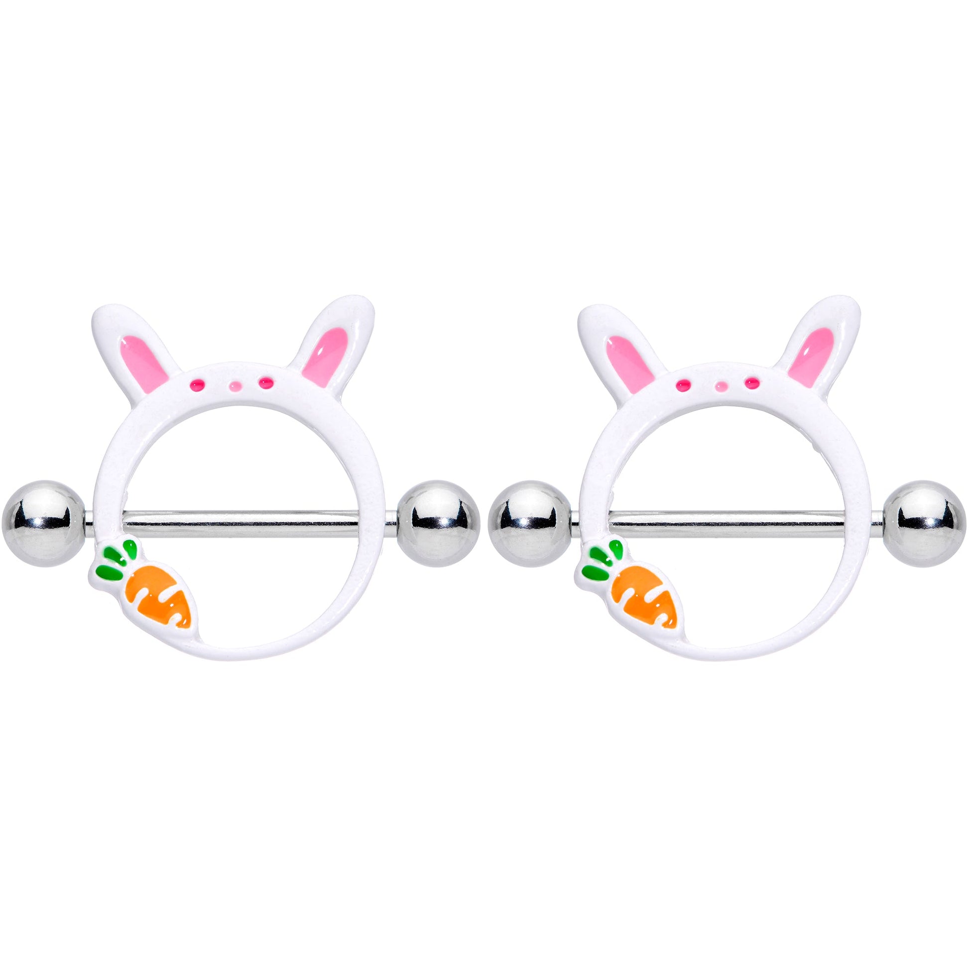 Some bunny is going to look adorable this Easter with this 14 gauge nipple jewelry! It's made with 14mm wearable length 316L surgical grade stainless steel straight barbells with 5mm ball ends and a total length of 11/16". The shield portion features white bunny rabbits, with pink detailing in the ears and facial features. The rabbits also have tiny carrot embellishments for a perfect splash of added color. Decorate your nipple piercings with these charming Easter bunnies this Spring for a truly festive feel! Sold as a set of two.Specifications