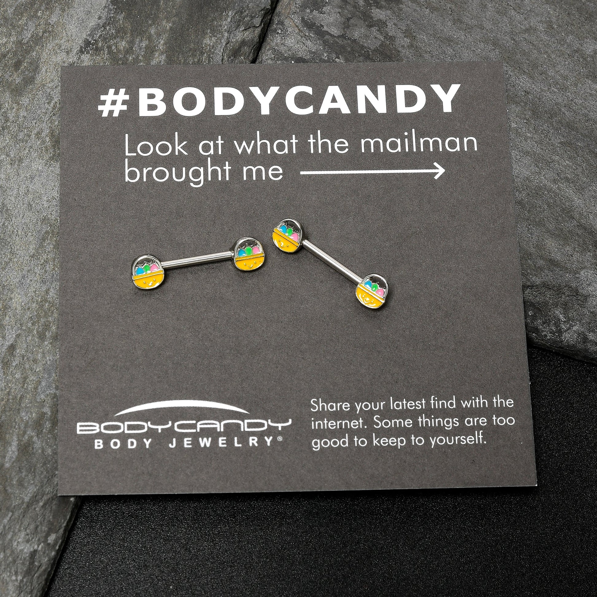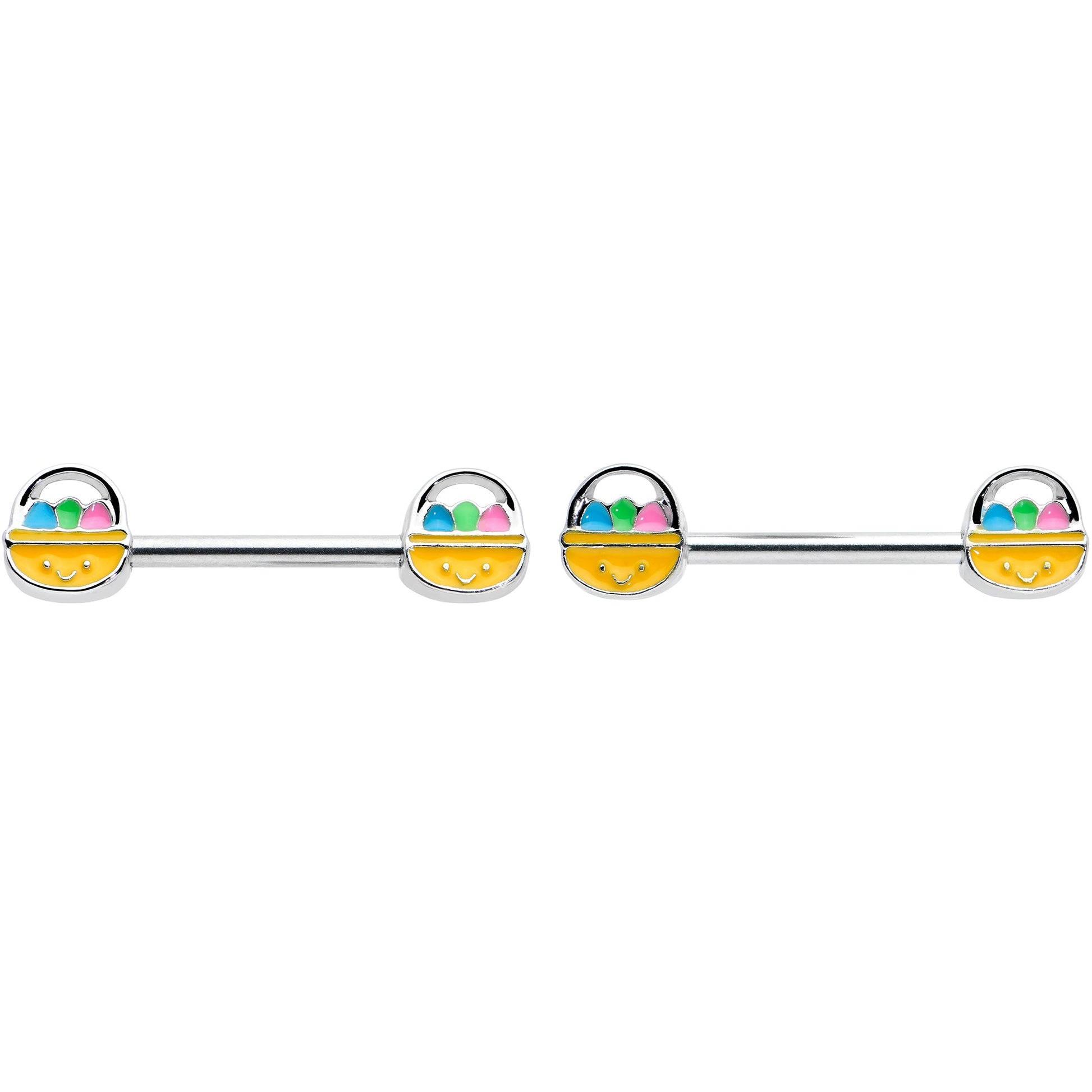 Put all your eggs in one basket with style when you're rocking this 14 gauge nipple jewelry! It's made with 14mm durable 316L surgical grade stainless steel straight barbells. Each of the ends features a yellow Easter basket charm, with a cheery smiling face. The baskets each contain Easter eggs in pink, green, and blue, for an added touch of festive color. You'll be hopping down the bunny trail in kawaii style with these Easter themed nipple piercing rings! Sold as a set of two.Specifications