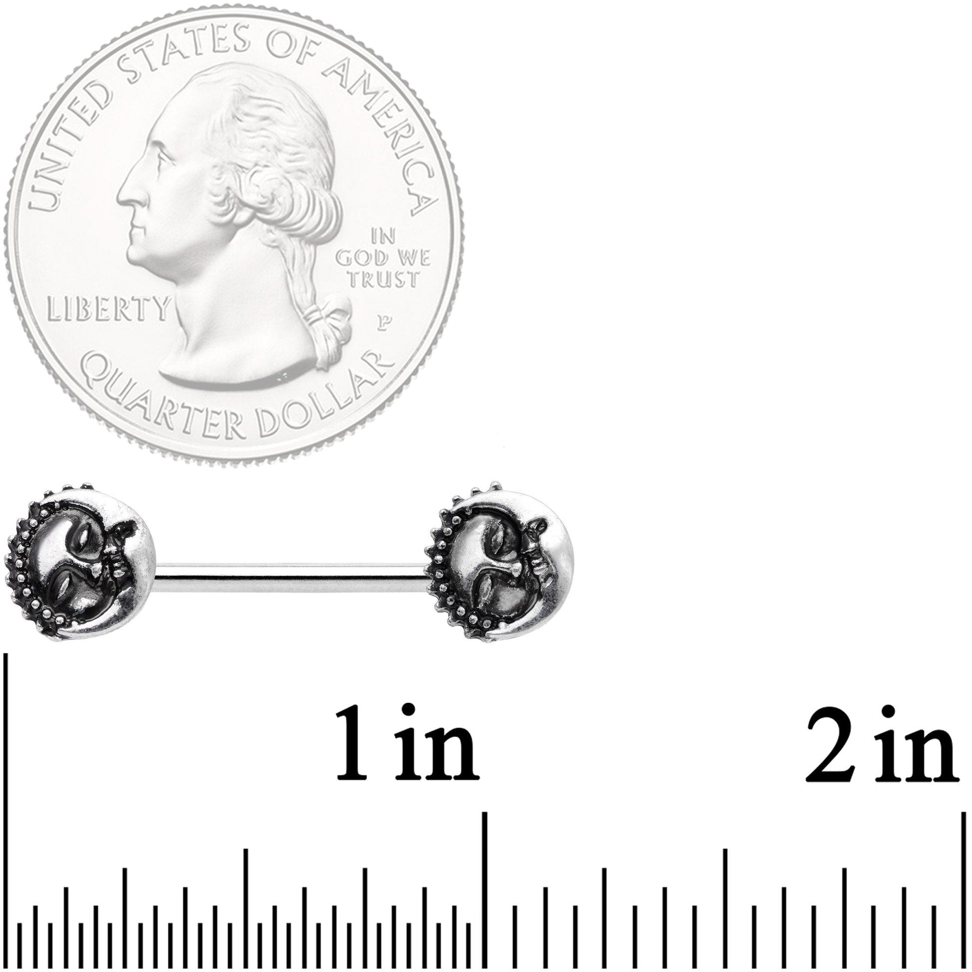 The sun and the moon have come together for a cuddle on these 14 gauge nipple piercings! Made with 14mm durable 316L surgical grade stainless steel barbells, they feature sun and the moon ends holding one another in a lover's embrace. Their faces are picked out in painstaking detail to show how utterly contented they are, and the sun's rays are clearly textured as well. You'll be just as happy as these two are when you have this set of nipple jewelry in your piercings! Sold as a set of two.Specifications