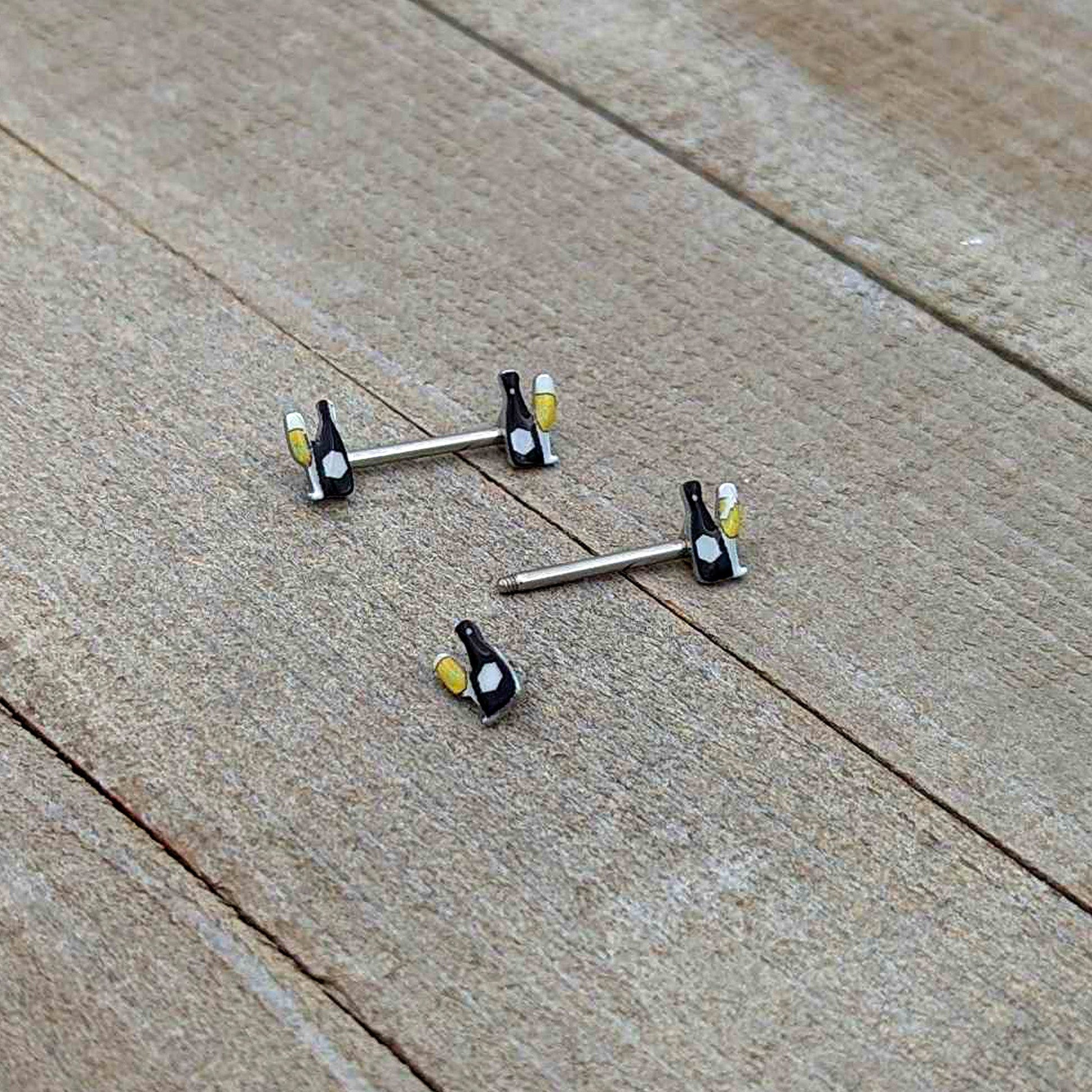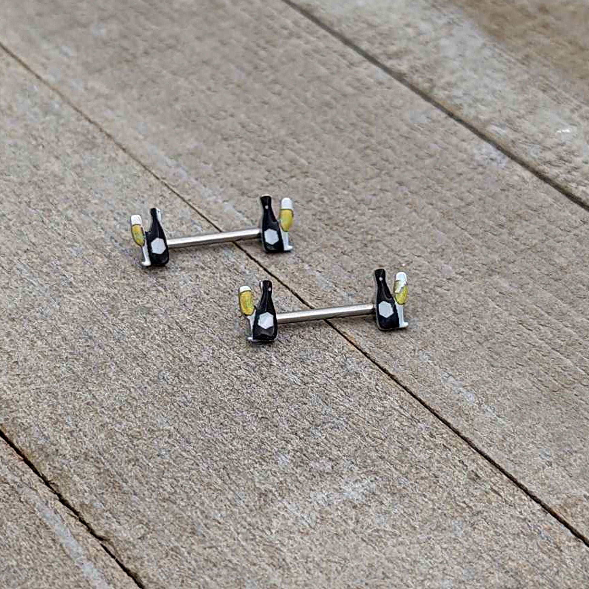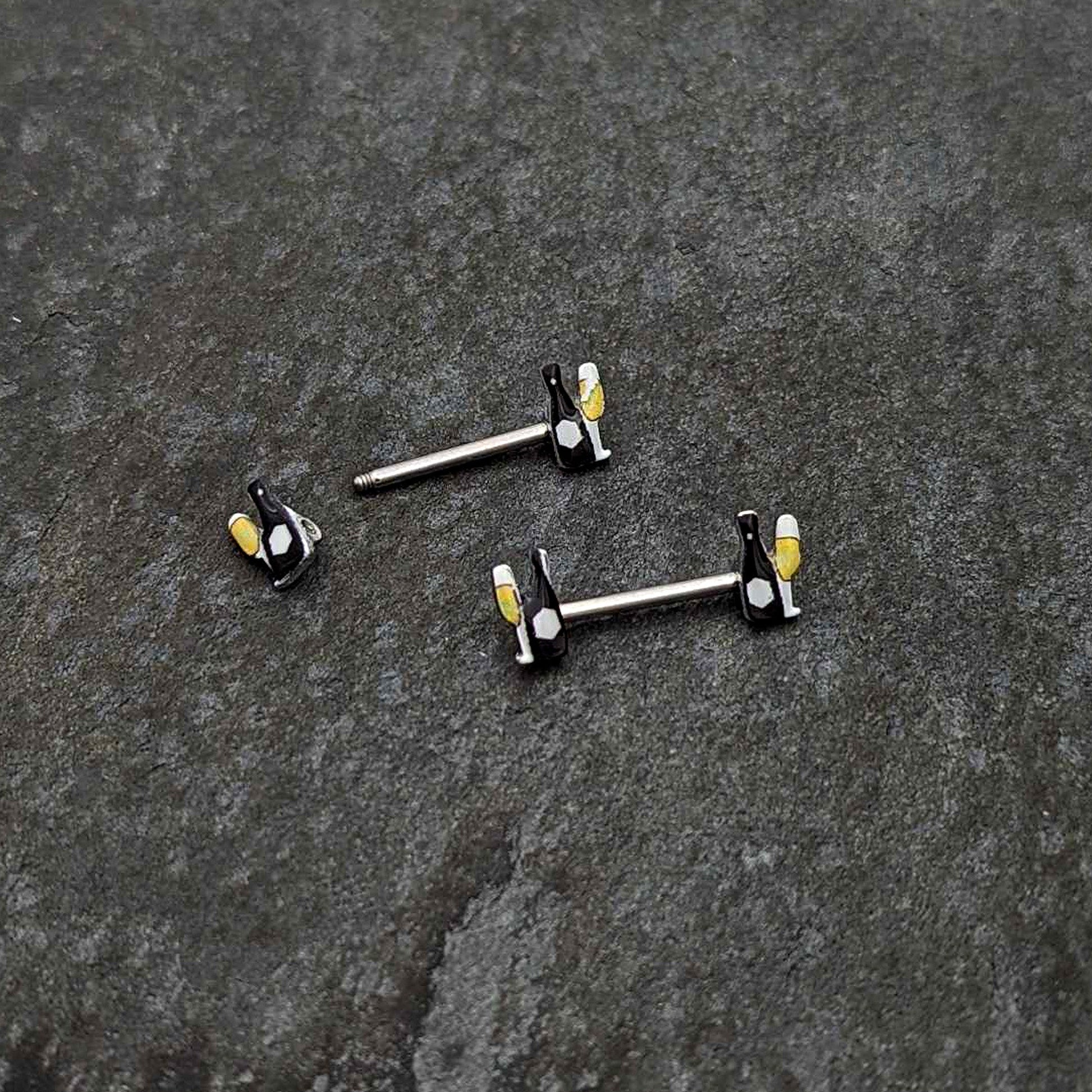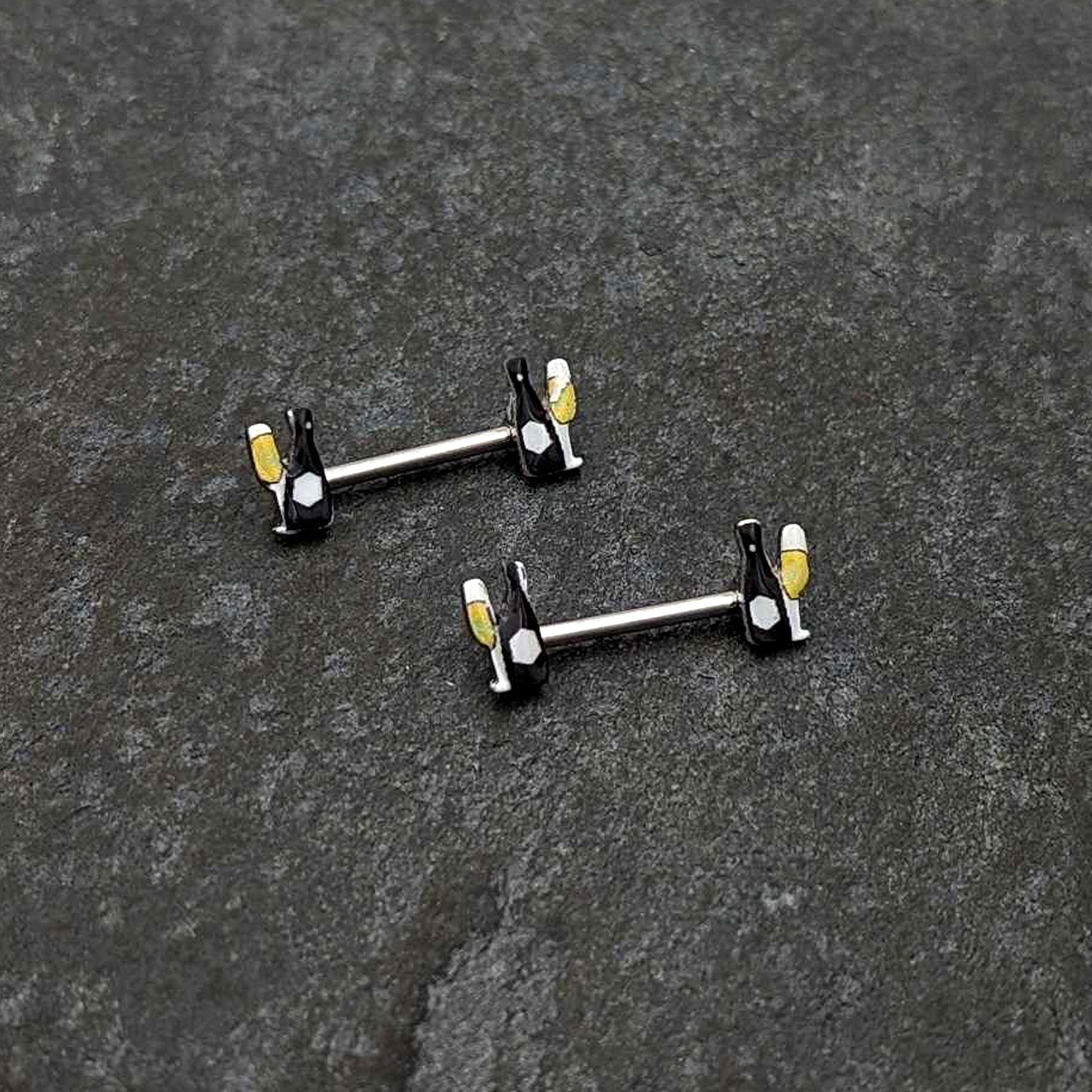 Pop the cork and ring in the new year with this elegantly styled 14 gauge nipple jewelry! It's made with 14mm durable 316L surgical grade stainless steel straight barbells. Each of the ends features a champagne charm, with the bottles inlaid in black with a grey label. Next to the bottles are matching champagne flutes with yellow inlaid bodies and bubble-inspired embellishments. You'll be ready to party when you're rocking these champagne themed nipple piercing rings! Sold as a set of two.Specifications