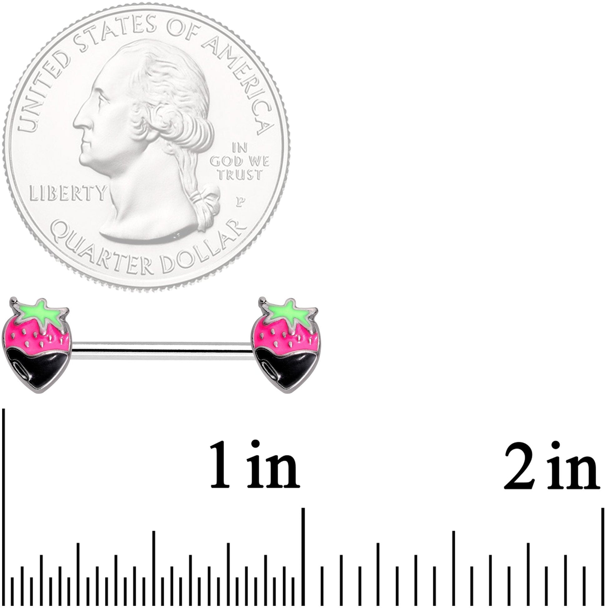 A ripe fresh strawberry is pretty awesome on its own but dipped in chocolate? Now that is one sweet pairing! These 14 gauge nipple piercings are made with durable 316L surgical grade stainless steel straight barbells. The ends feature charms of strawberries, with their lower halves dipped in chocolate. They're bright pink and green with textured seeds, and the chocolate inlaid in a deep rich brown. Those are some tasty looking nipple rings and bound to look quite delicious in your piercings! Sold as a set of two.Specifications