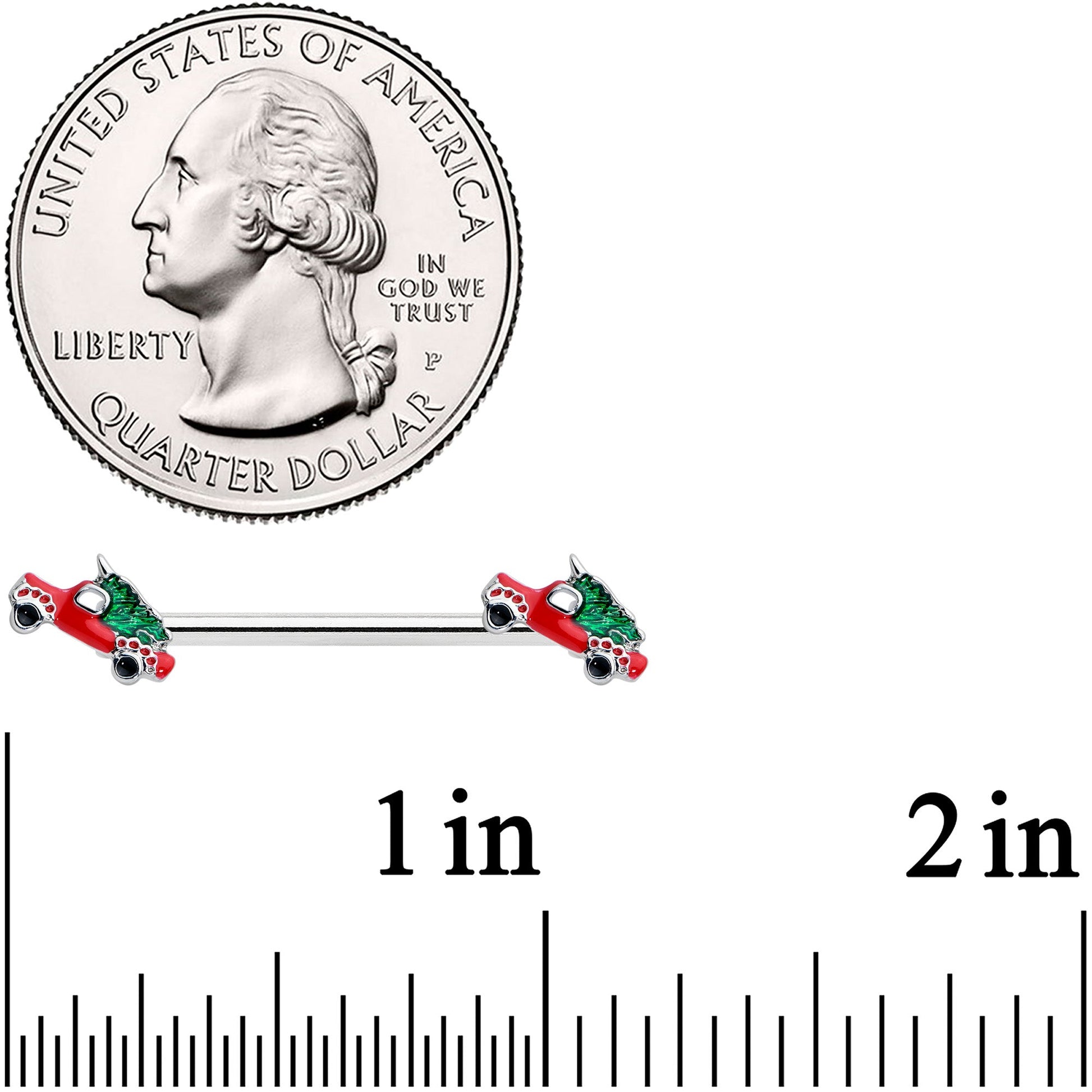 Bring home the boughs and start decorating with this 14 gauge nipple jewelry! It's made with 14mm durable 316L surgical grade stainless steel straight barbells. Each of the ends features a truck charm, inlaid in red with black wheels. In the back of the truck is a festive green Christmas tree, on its way to get decorated for the season. Rock a tree in a truck without having to fight traffic with these Christmas-themed nipple piercing rings! Sold as a set of two.Specifications